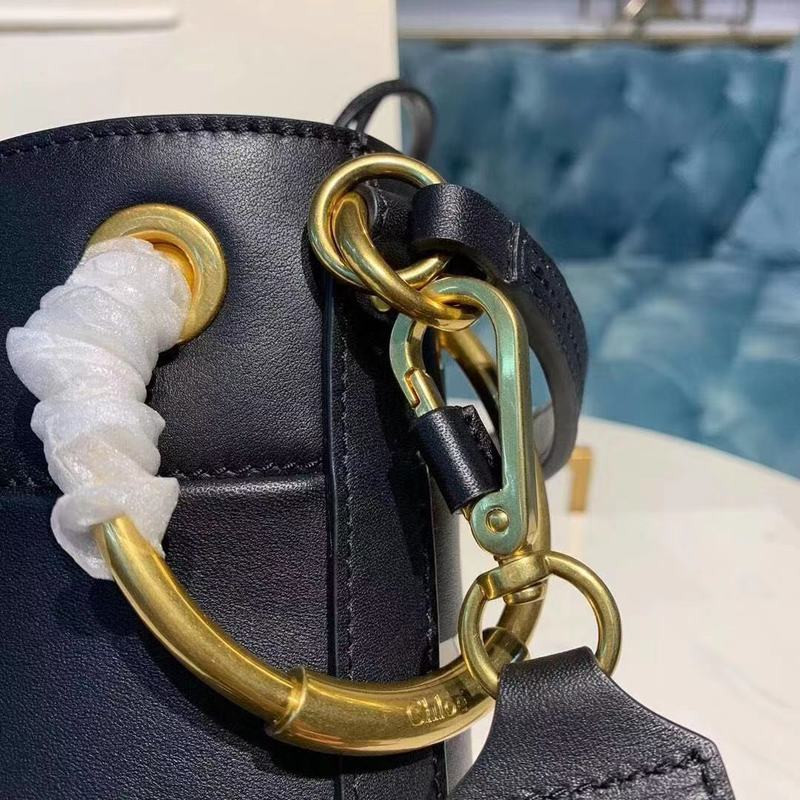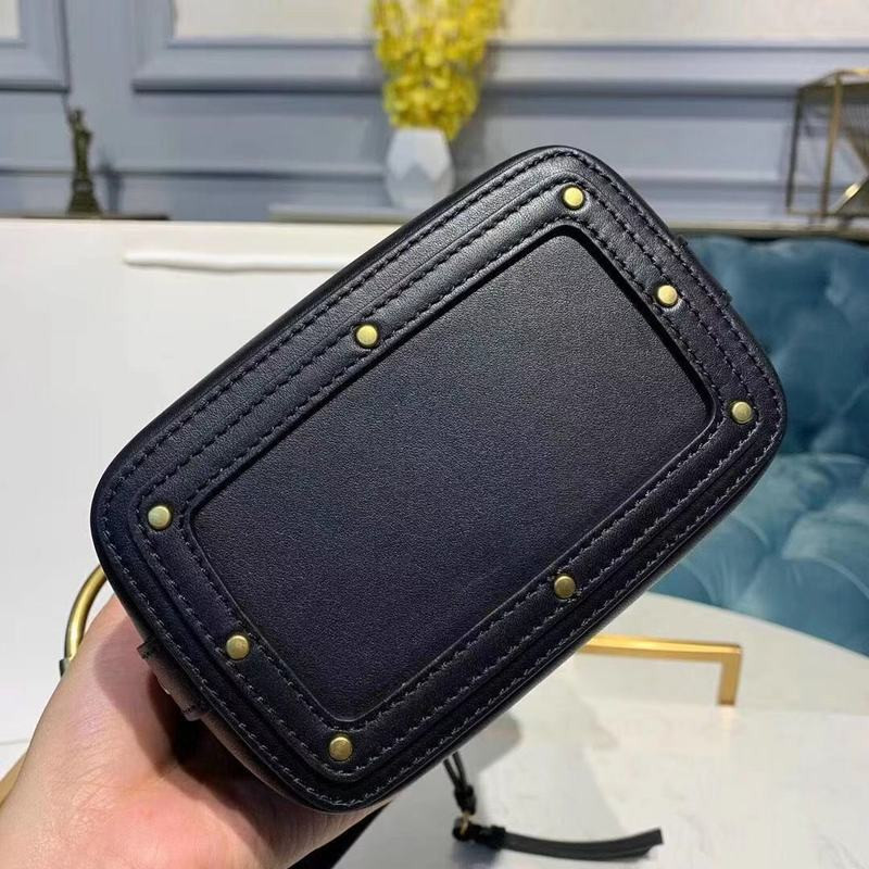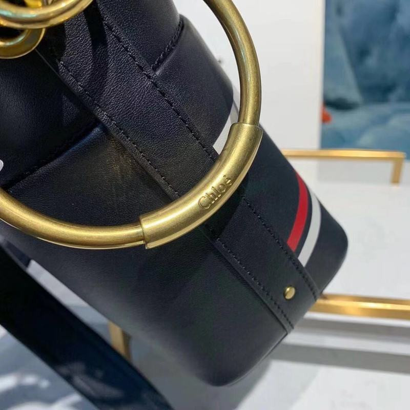 Bold logo embossing and signature pierced-ring hardware brand a smooth leather bucket bag styled with a duo of straps for carrying versatility. Carry handle at top. Adjustable and detachable shoulder strap featuring white suede inlay and lanyard clasp fastening. Stripes and logo bonded in white and red at face. Logo-engraved hoop hardware at sides. Extended beige canvas lining with drawstring fastening at throat. Logo patch at interior. Beige canvas lining. Bumper studs at base. Gold-tone hardware.