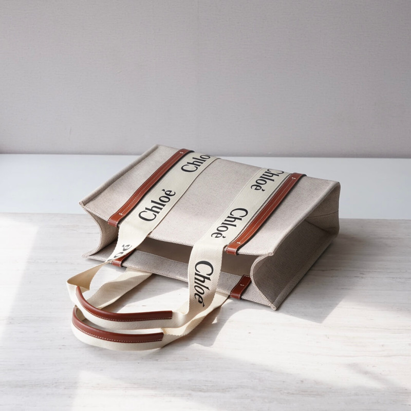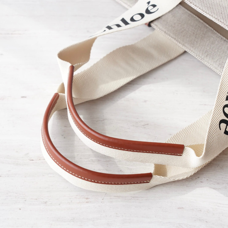 The bag s sharp, modern lines are emphasized by the contrasting vertical leather strips and the signature Chloé logo ribbon in lower-impact linen, carried over from the Maison s Woody mule. Carry this tote bag comfortably on the shoulder.