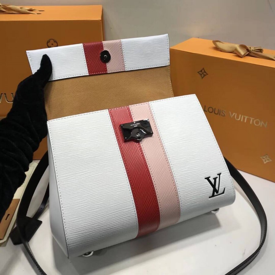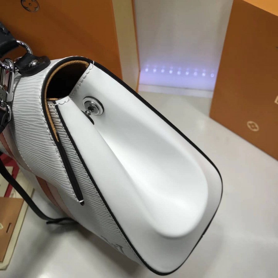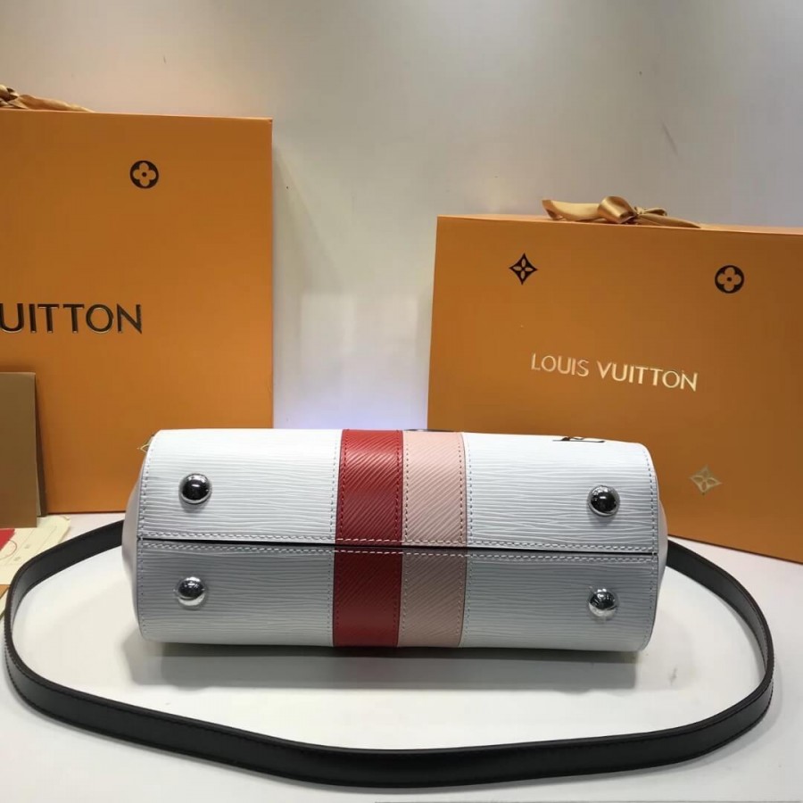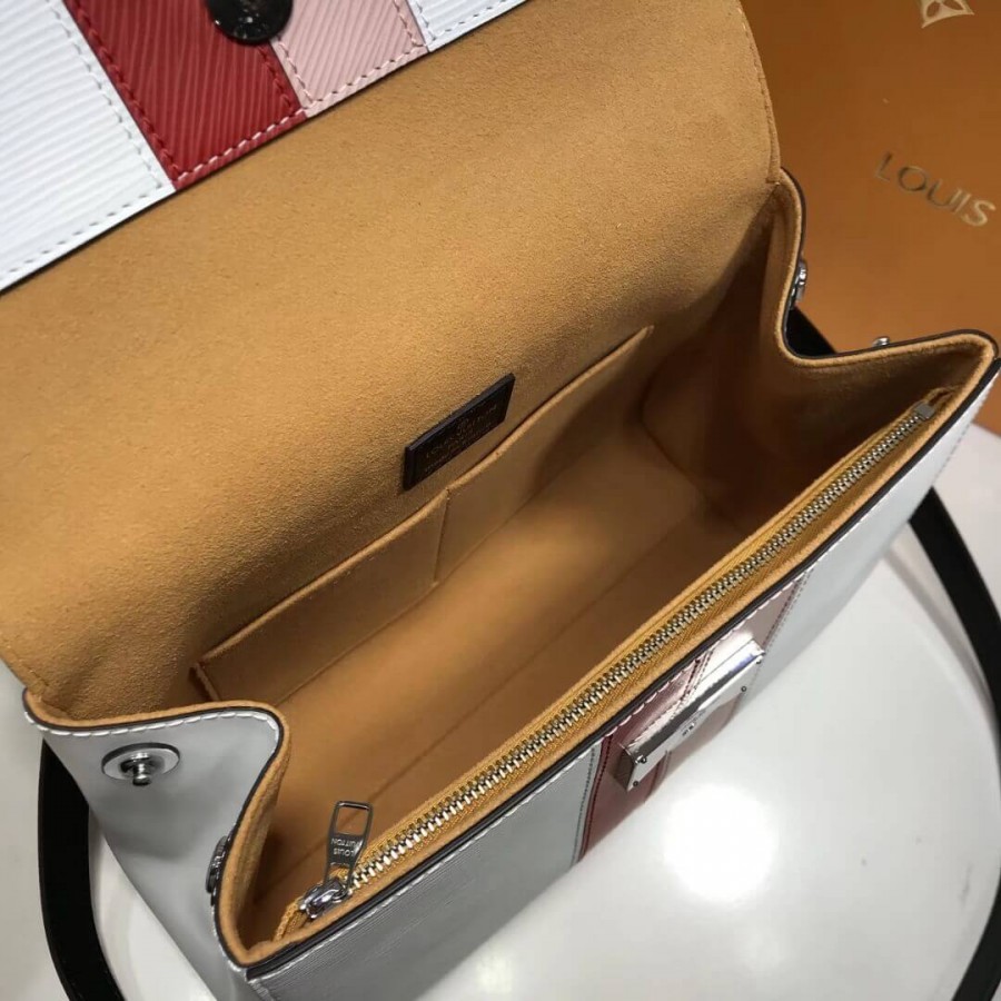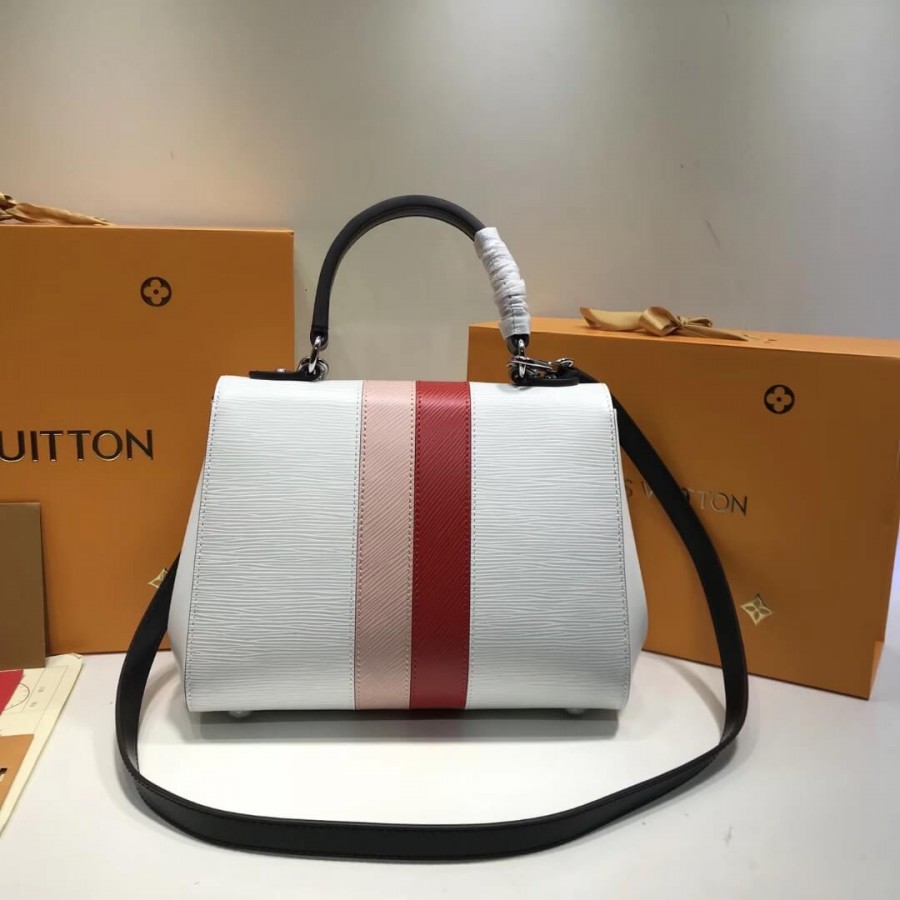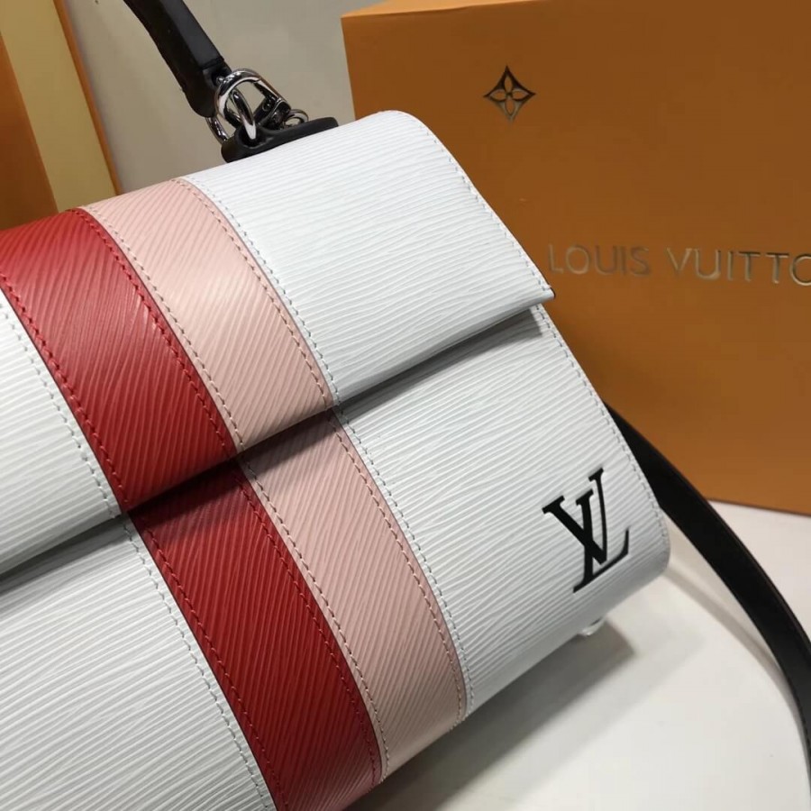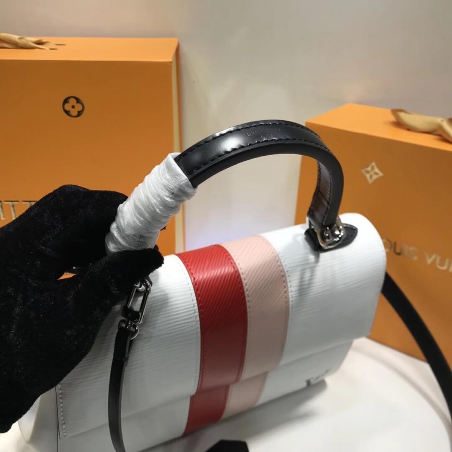 This Cluny BB handbag’s structured silhouette is crafted of grained Epi leather with smooth leather trim and two eye-catching stripes. The two-tone stripe, a theme seen on shoes at the Fall 2018 Collection, is a nod to the House’s tradition of personalizing its historic trunks. Silver-tone hardware pairs with colorful touches to complete this bag’s distinctive look.