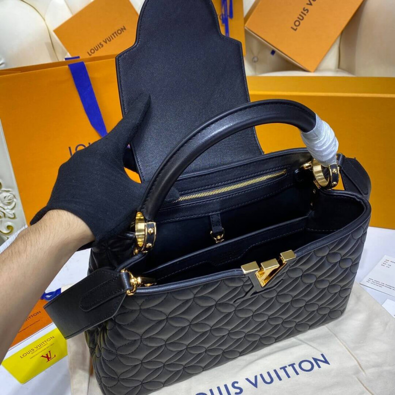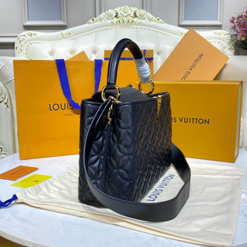 The elegant quilting of this Capucines MM handbag subtly reprises the Monogram Flower design, a pattern that also features in the décor of Louis Vuitton stores. Both the body and trim of this sophisticated model are crafted from soft lambskin. The bag’s removable strap is extra wide, for an especially comfortable shoulder carry.