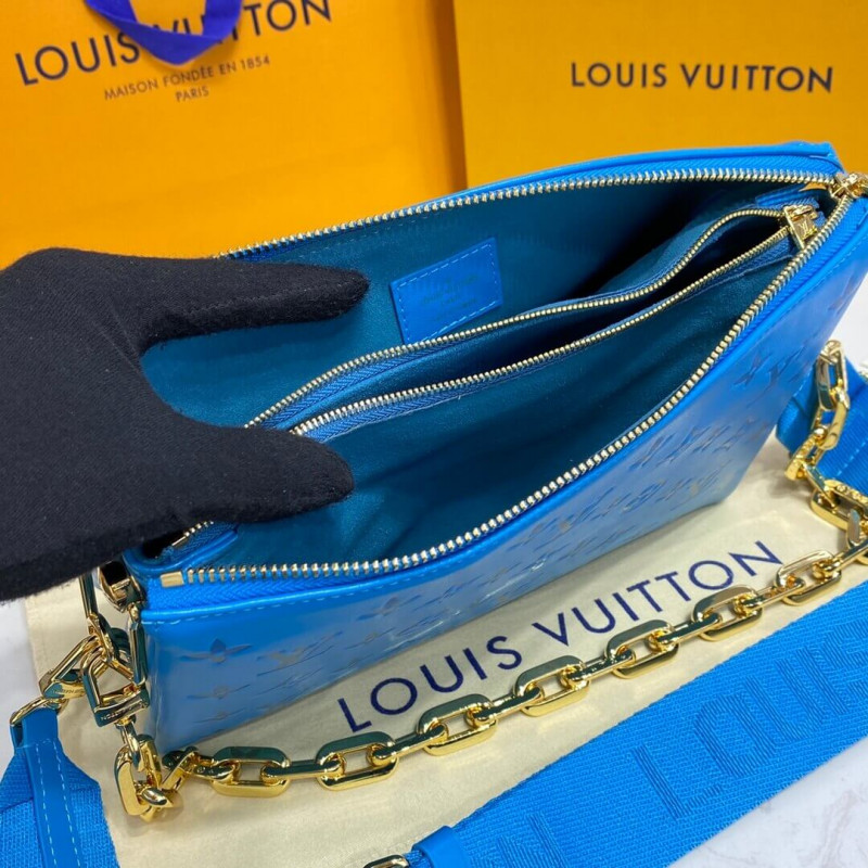 The on-trend Coussin PM handbag comes in a new color this season: bright turquoise. Made from puffy lambskin and accessorized with a chunky gold-color chain, the Coussin is comfortable to carry thanks to its pillow-like form. Its wide, removable strap can be adjusted for shoulder or cross-body carry.
