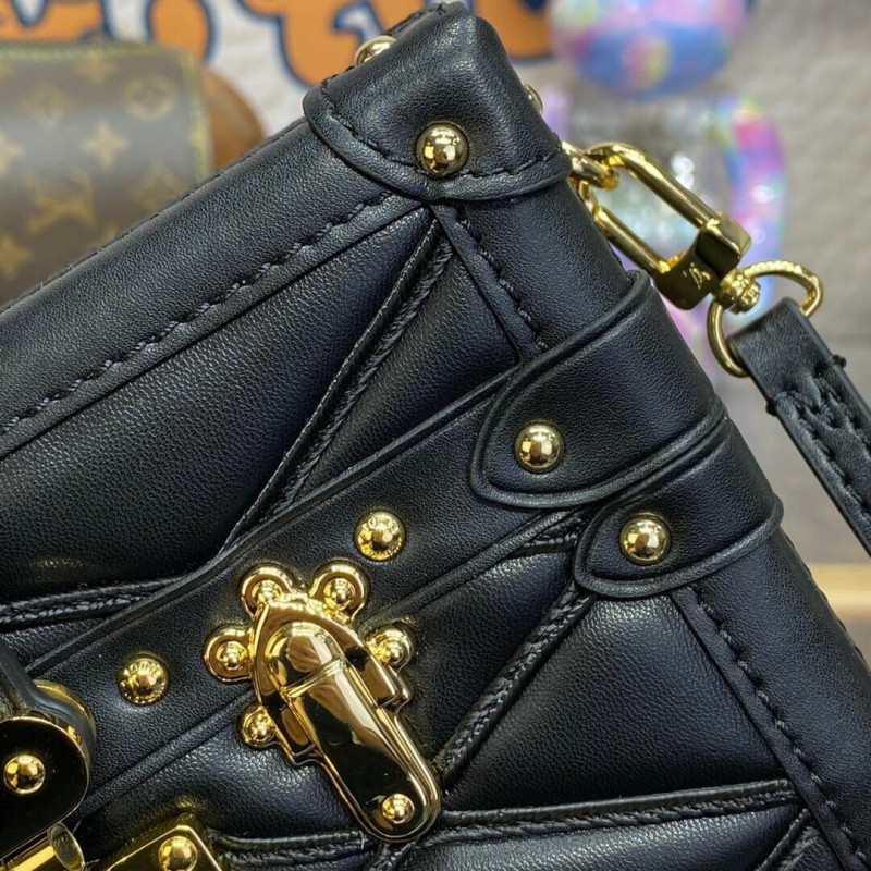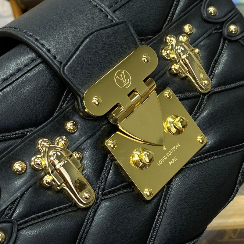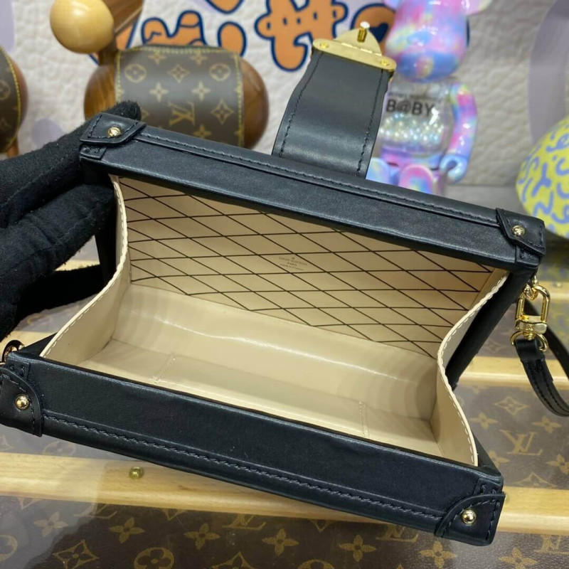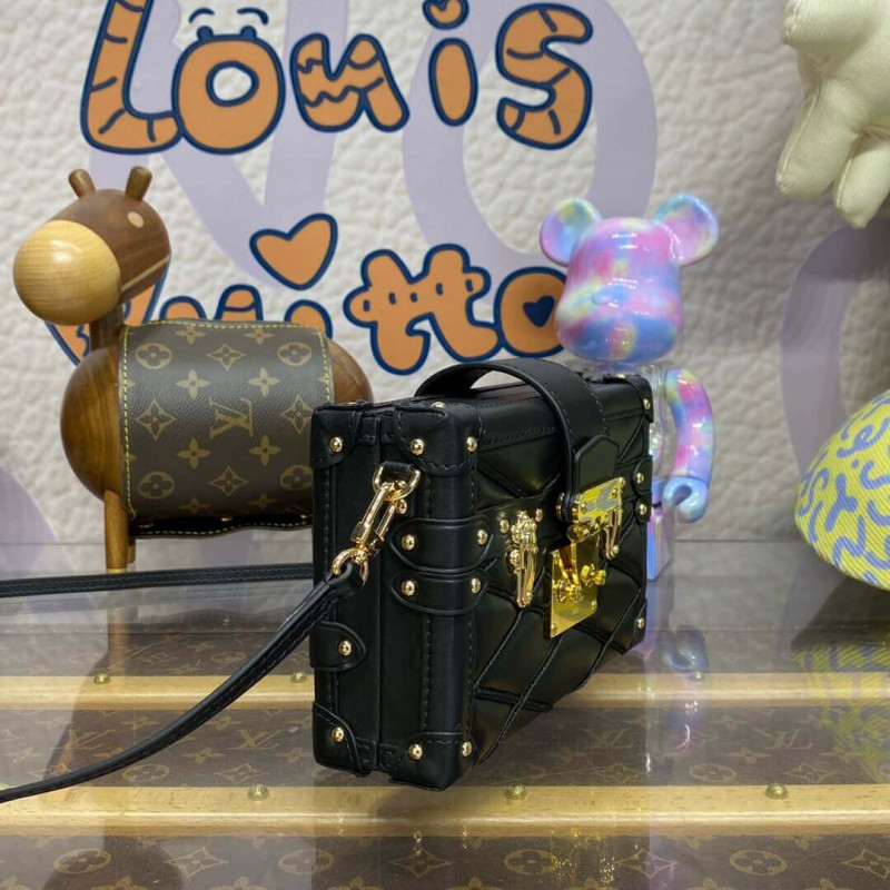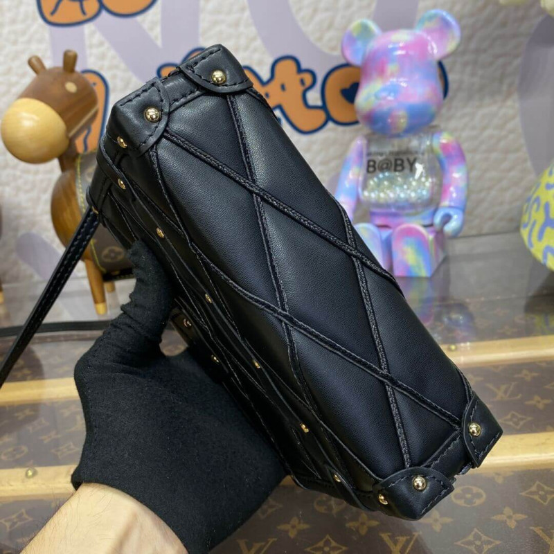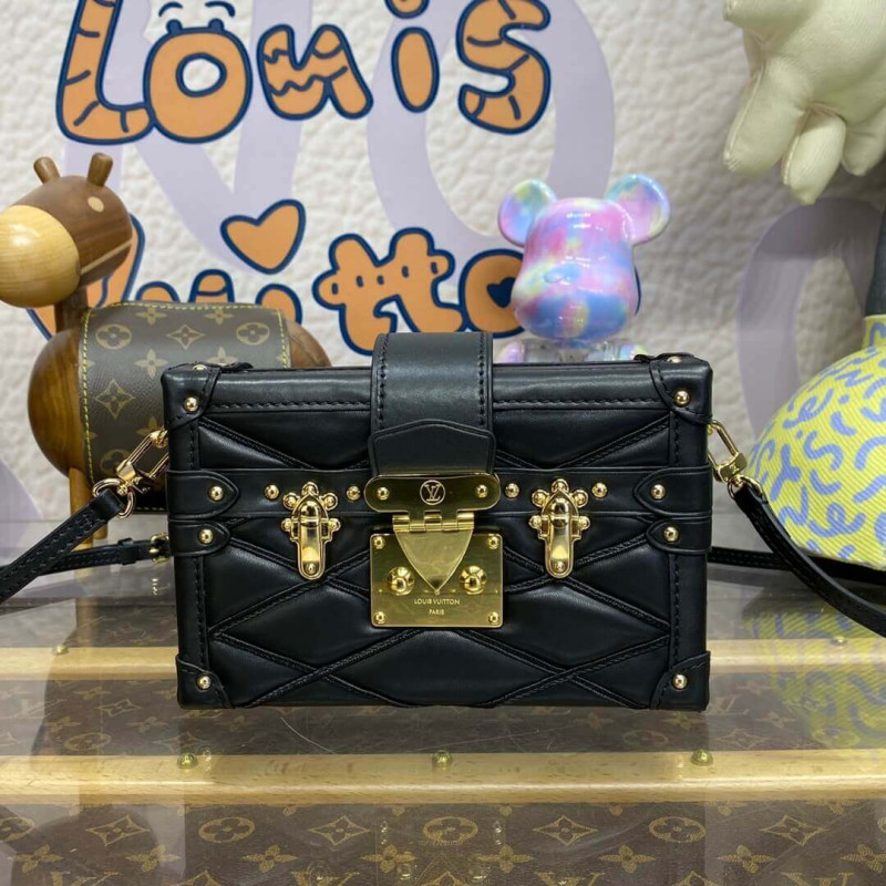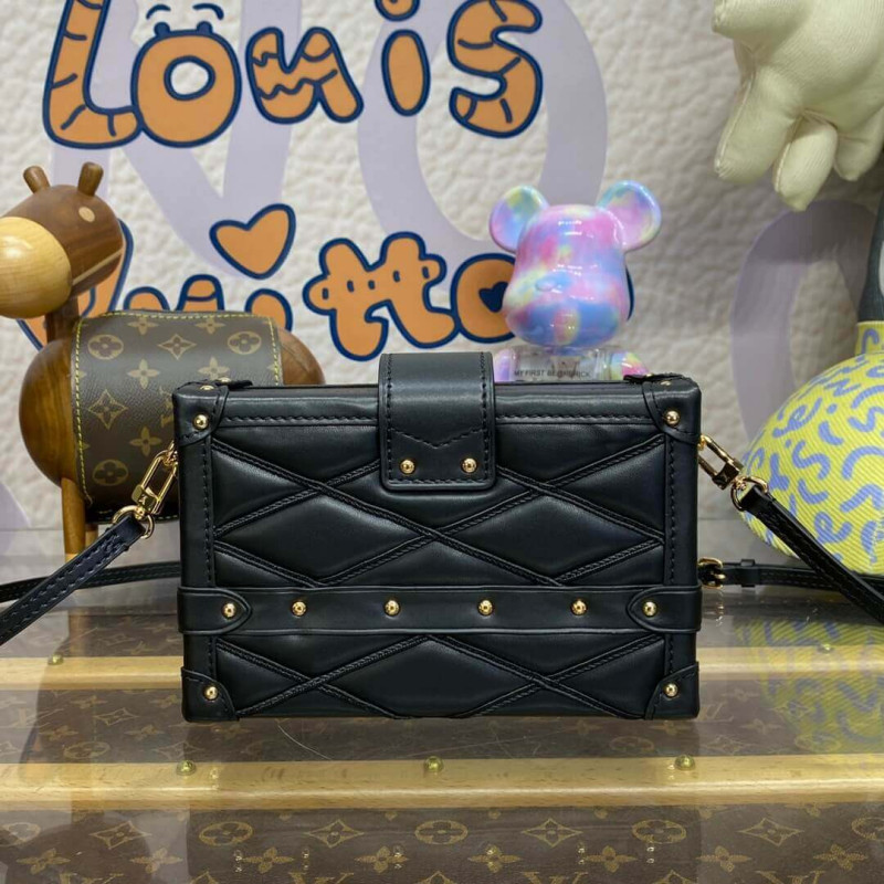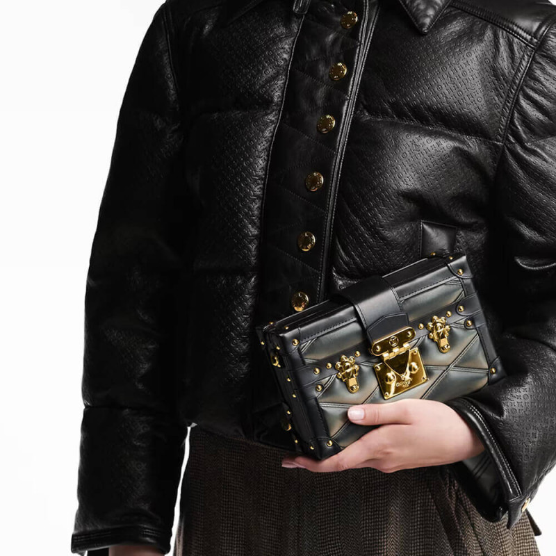 The Petite Malle handbag takes on a luxurious feel in padded lambskin with a hand-sprayed shaded effect. The magnetic S-lock is a light golden color as is the rest of the hardware detailing. The inside is lined with sheepskin leather. The removable strap adjusts for shoulder and cross-body carry.