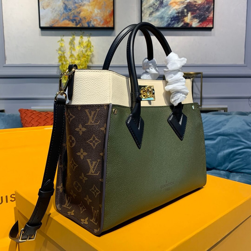 The On My Side tote bag is fashioned from an elegant combination of small-grained calf leather and emblematic Monogram canvas. The large outside pockets in contrasting canvas create a bag-in-a-bag look. The roomy interior can easily hold everything needed for a day at the office while the adjustable strap makes for practical cross-body carry.