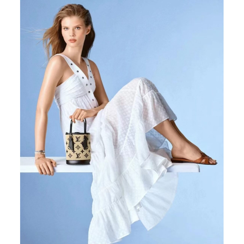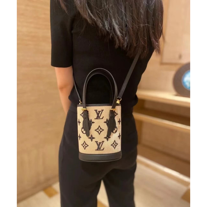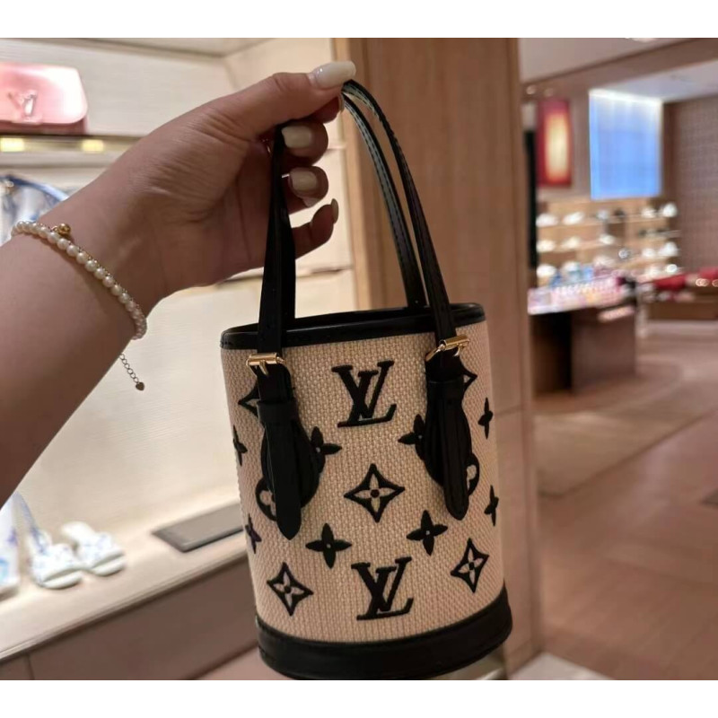 This elegant iteration of the Nano Bucket is crafted from natural cotton with black leather trim and a black Monogram pattern. This miniature bucket bag has two adjustable leather handles and an adjustable, removable shoulder strap, offering different carry options. Its inside compartment contains a leather key holder.