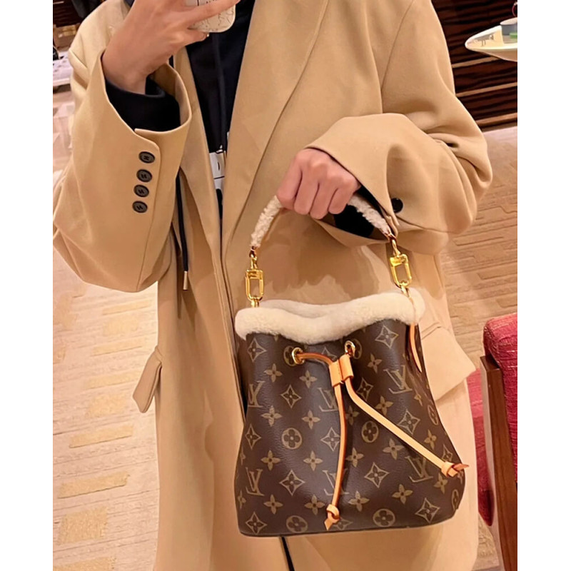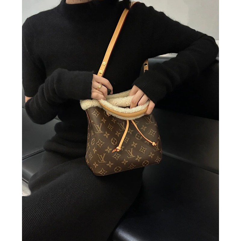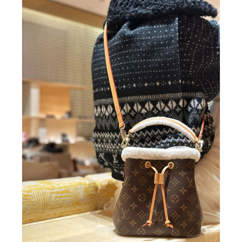 The Cozygram capsule combines iconic Monogram canvas, cream-colored shearling and aged natural leather in an exclusive line of handbags, featuring this covetable NéoNoé BB. One of the Maison’s most iconic models, it looks wintry-fresh with a top handle and border of soft, fluffy fleece. The bag’s long leather strap adjusts for different styling options.