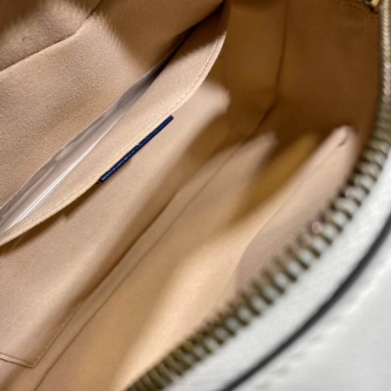 The zip-top small GG Marmont bag is introduced in white diagonal matelassé quilted leather for Pre-Fall 2020, completed with a twisted torchon Double G embellishment. The chain shoulder bag is outlined in contrast dark blue piping and has a leather shoulder detail for added comfort.