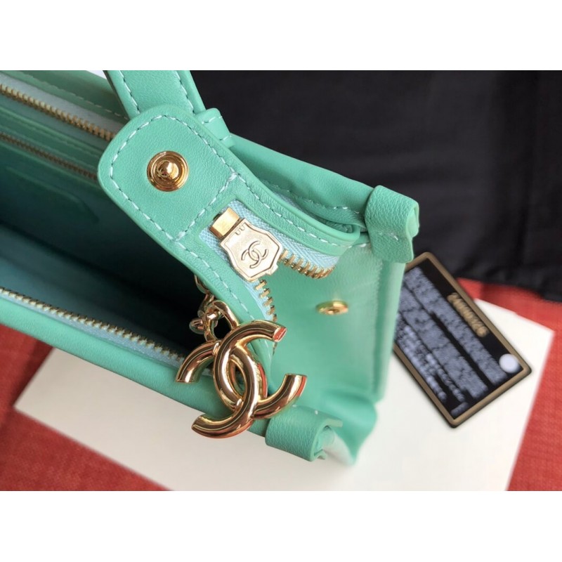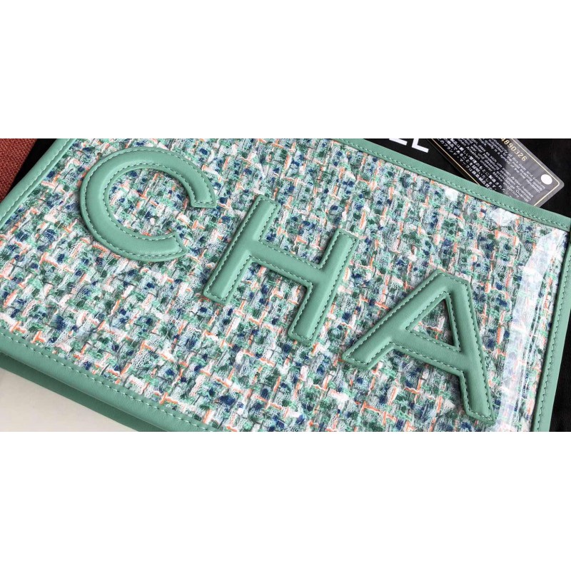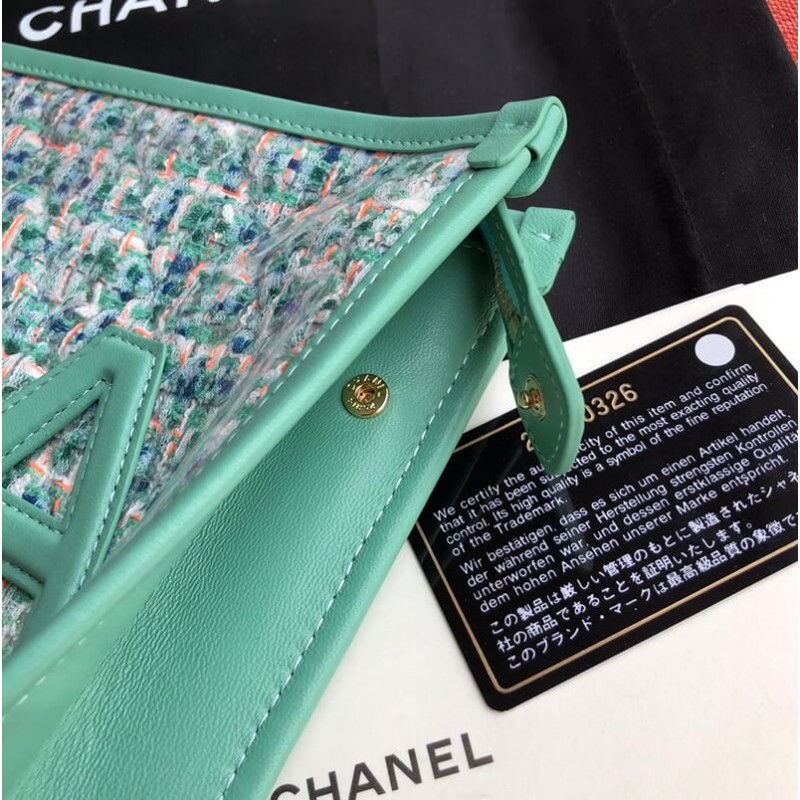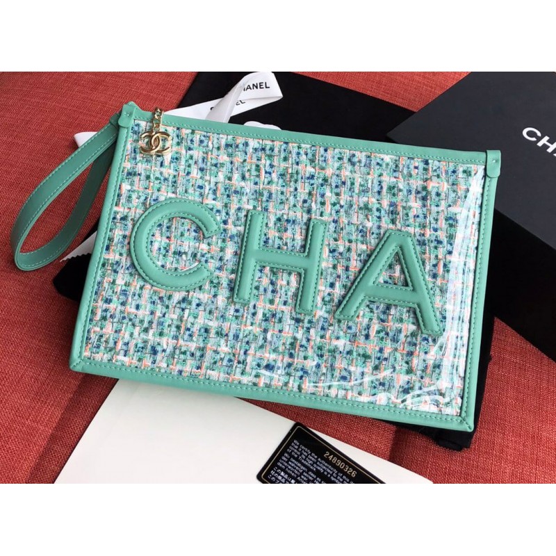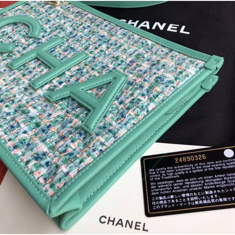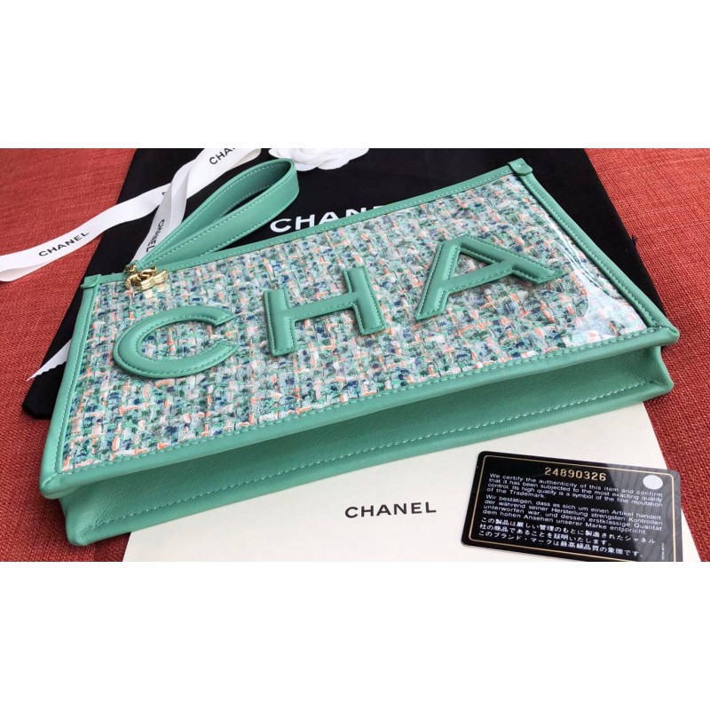 This pouch is fancy, colorful and stunning to wear for the upcoming summer. And best of all, it’s made from Tweed but protected by the PVC cover. And because of this, this little glamorous pouch can withstand scratches and rain. As that is not fashion enough, the front and back are stitched with the CHANEL logo. The CHA on the front and NEL on the back. The pouch can be opened with a zip, which is attached to a wrist strap for carrying comfort. This zip is also attached to a CC Charm.