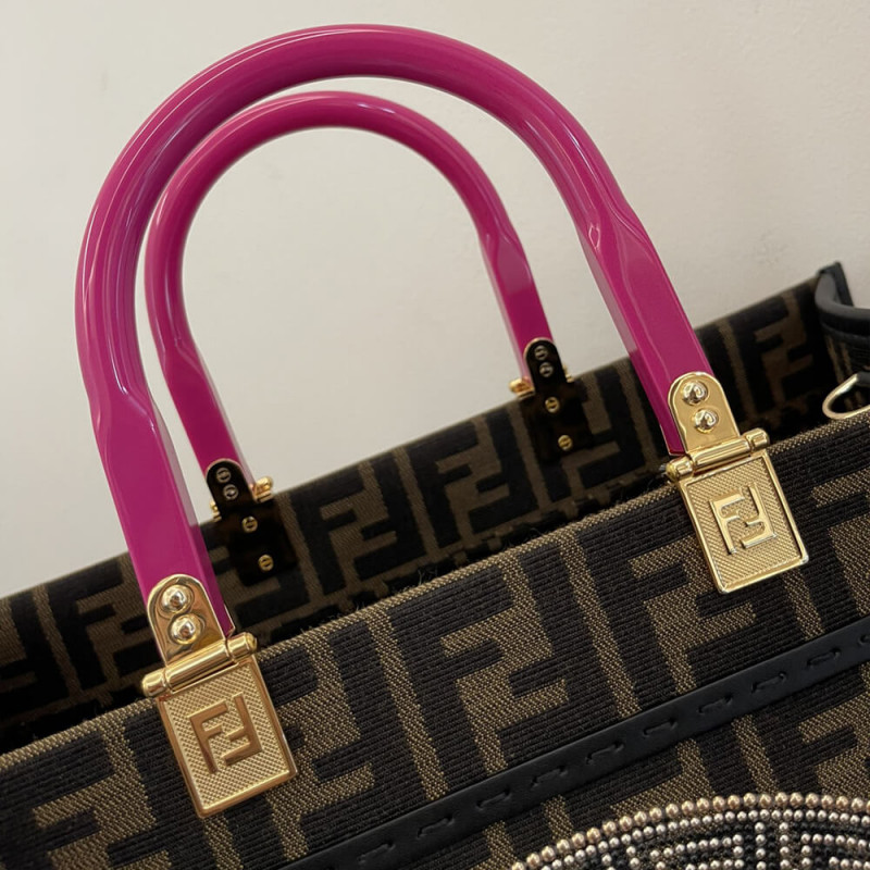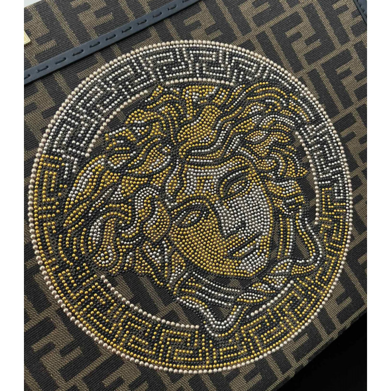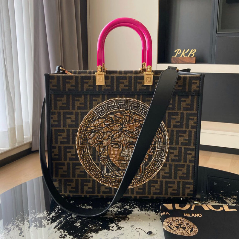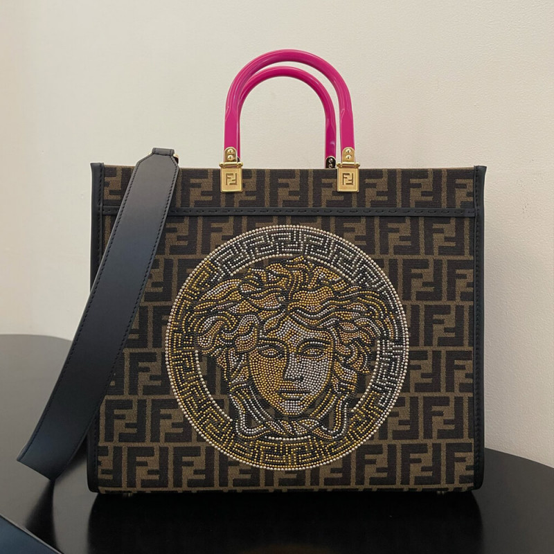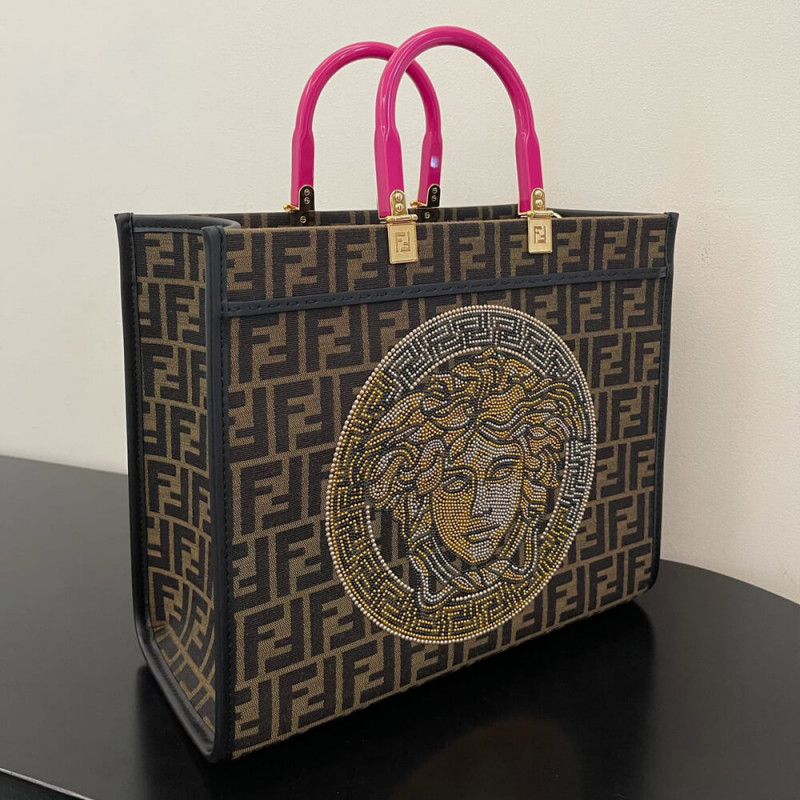 Seen through the eyes of Donatella Versace, Fendi s Sunshine canvas tote bag is reimagined with Very Versace elements in the latest Fendi by Versace capsule collection. In a jacquard FF monogram print, it features signature hinged rigid handles. The spacious shopper is complete with a studded and crystal embellished Fendace Medusa at the front.