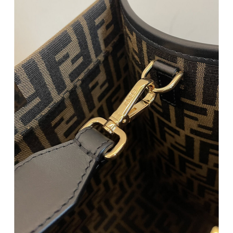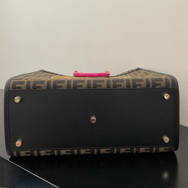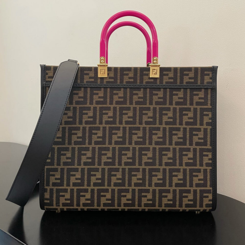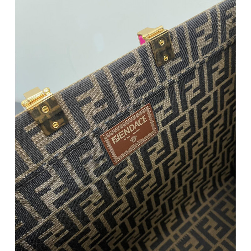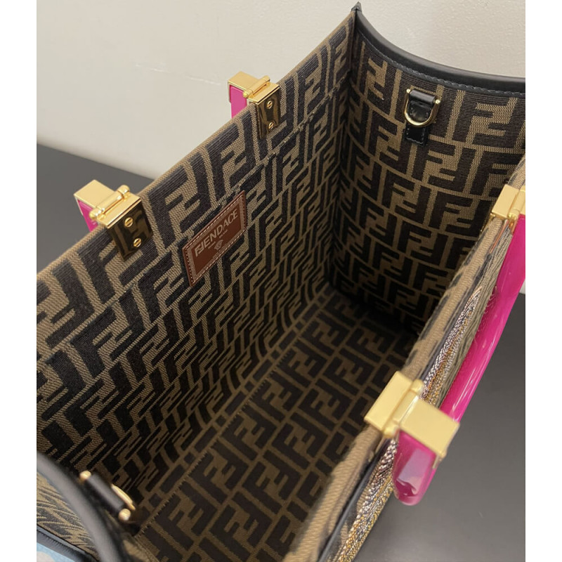 Seen through the eyes of Donatella Versace, Fendi s Sunshine canvas tote bag is reimagined with Very Versace elements in the latest Fendi by Versace capsule collection. In a jacquard FF monogram print, it features signature hinged rigid handles. The spacious shopper is complete with a studded and crystal embellished Fendace Medusa at the front.