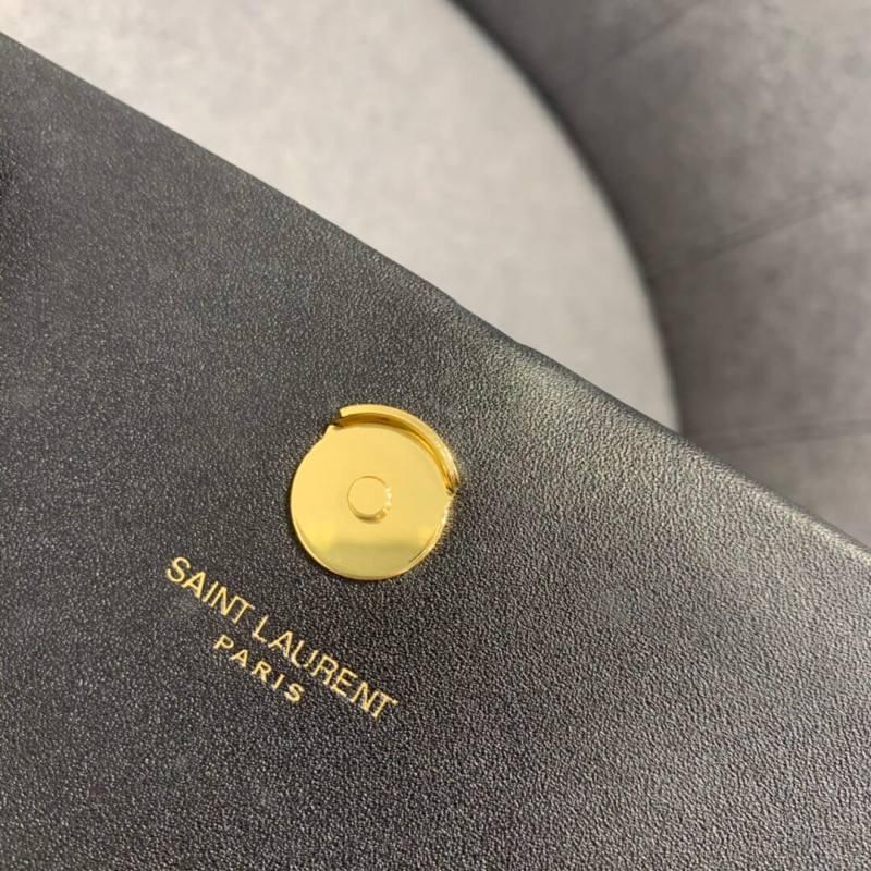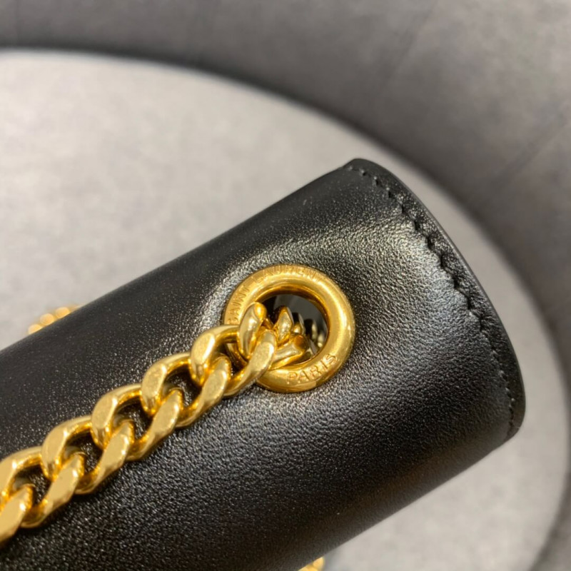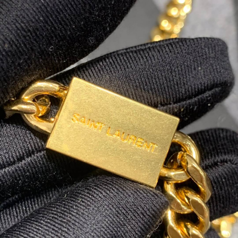 Classic saint laurent shoulder bag with interlocking metal ysl signature and metal chain tassel.