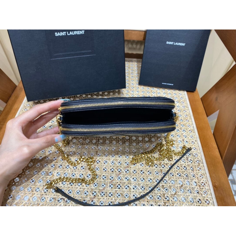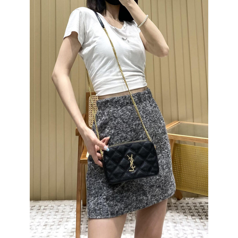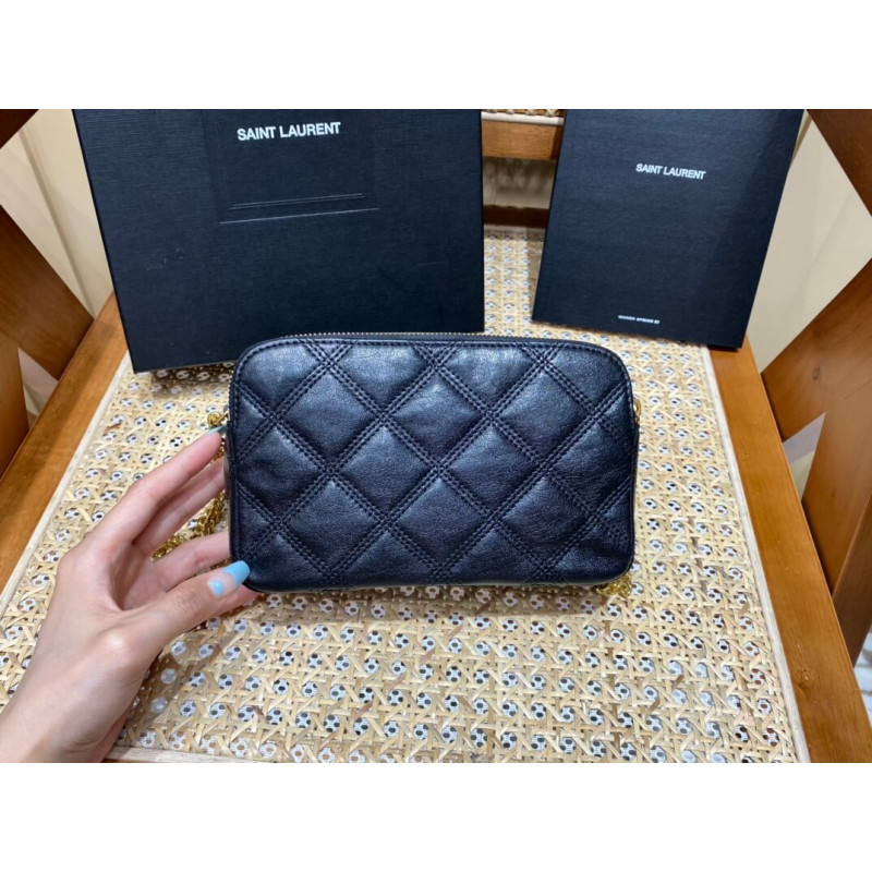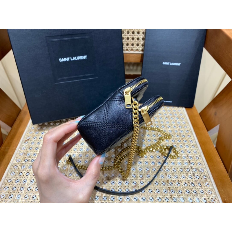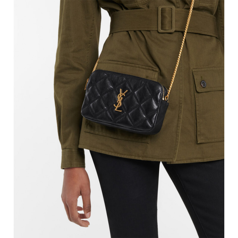 Diamond-quilted double-zip pouch made with metal-free tanned leather and organic cotton lining, decorated with metal ysl initials, featuring a chain and leather shoulder strap.