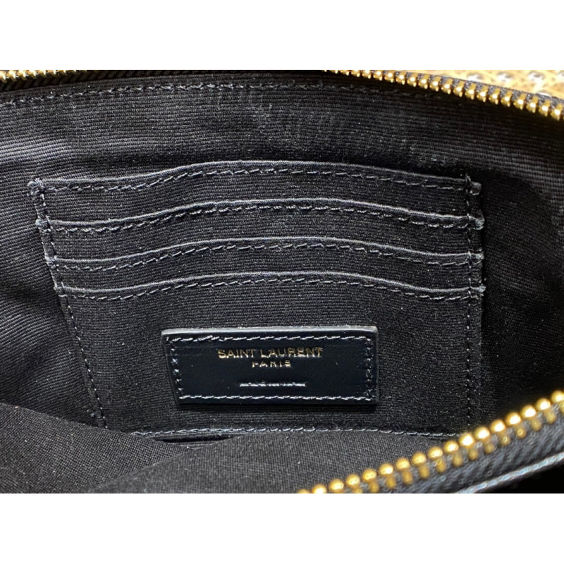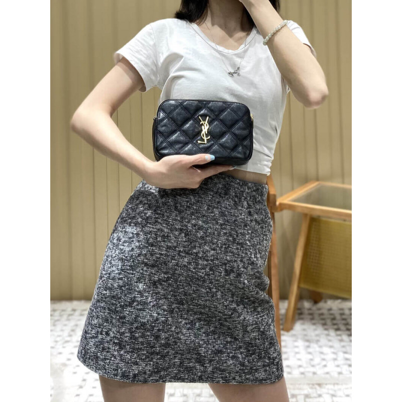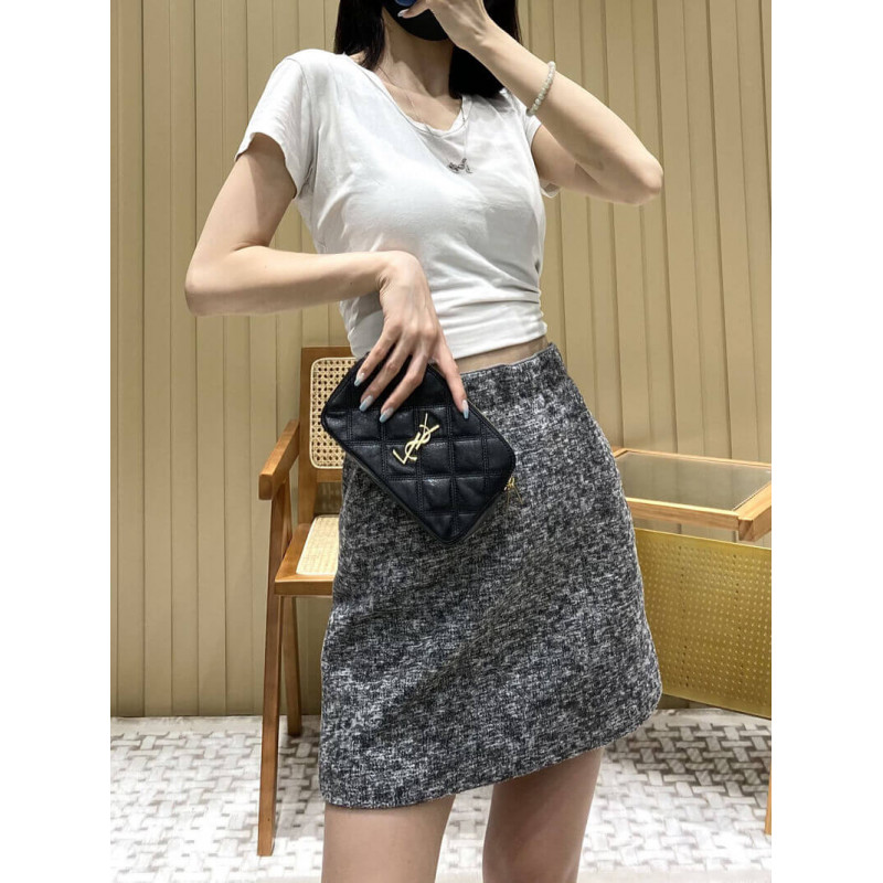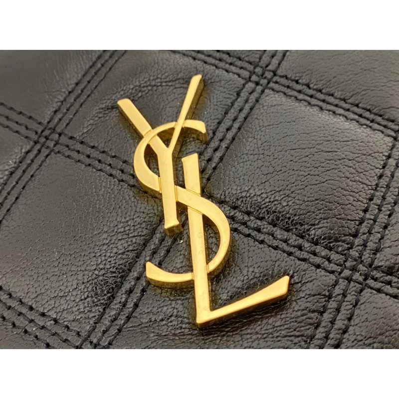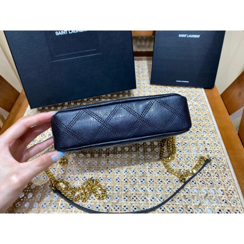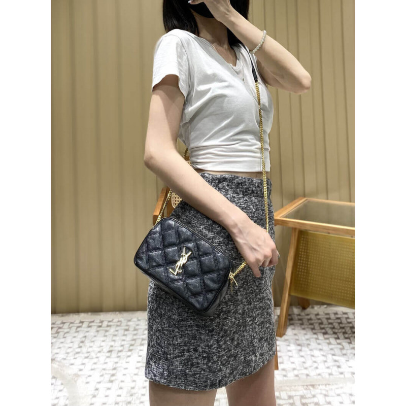 Diamond-quilted double-zip pouch made with metal-free tanned leather and organic cotton lining, decorated with metal ysl initials, featuring a chain and leather shoulder strap.