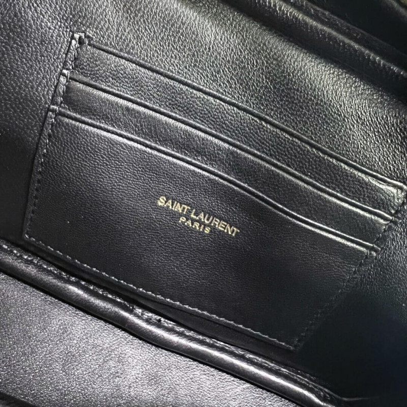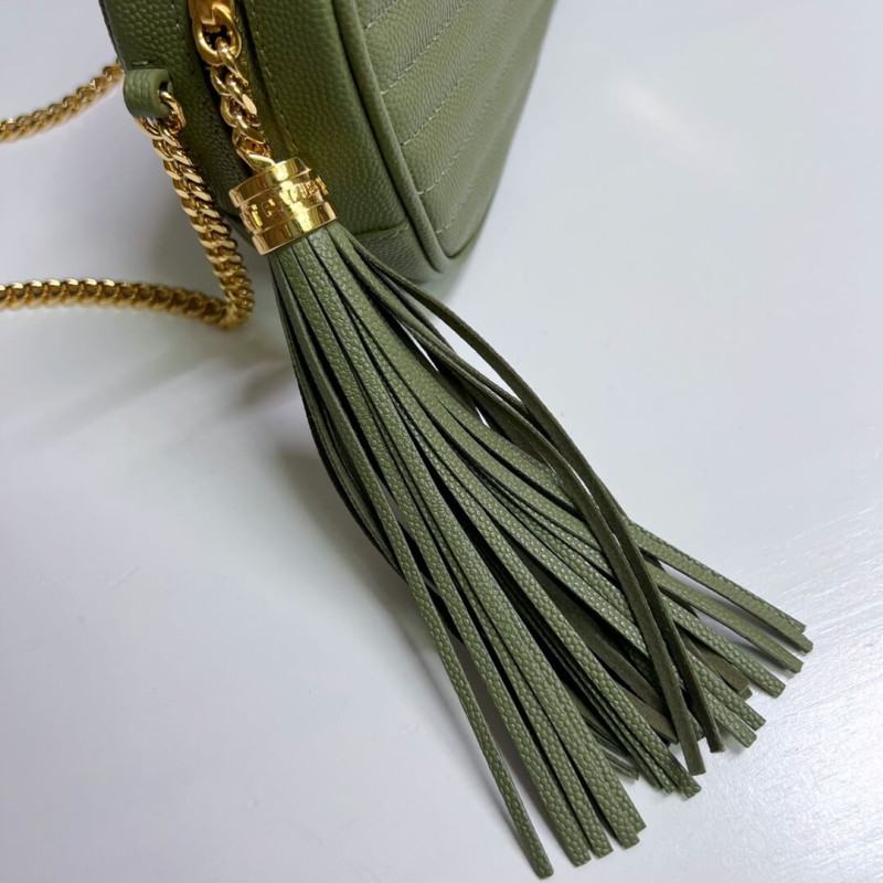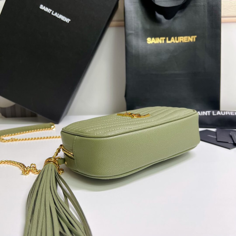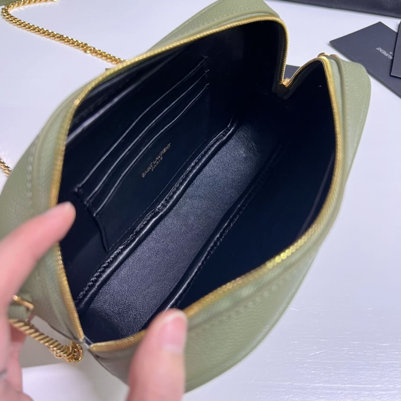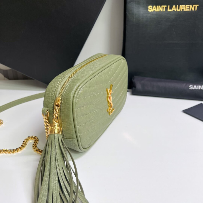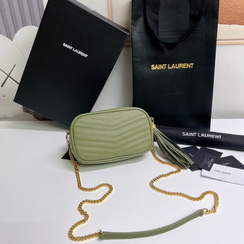 - Saint Laurent "Lou" camera bag in chevron-quilted calf leather with metal YSL monogram on front