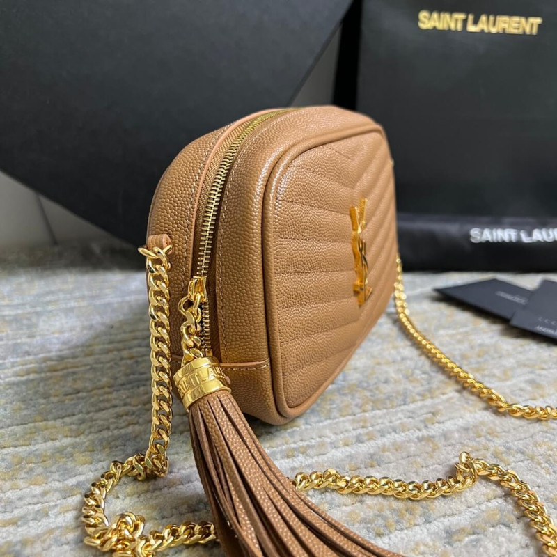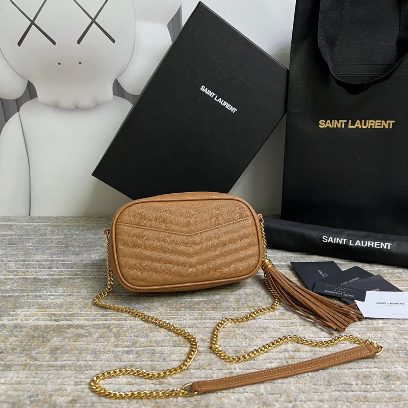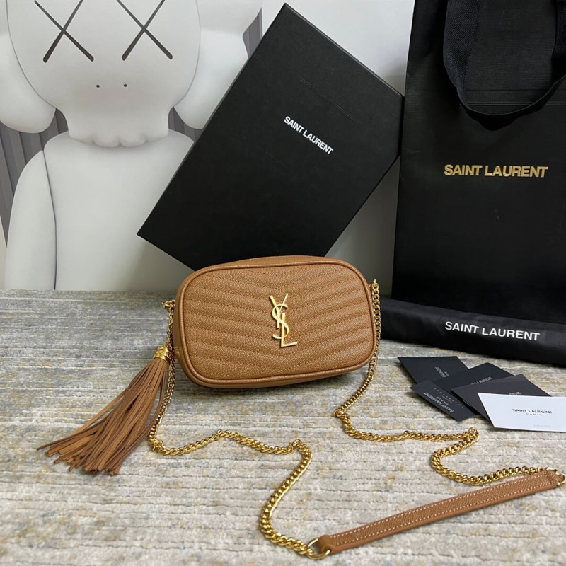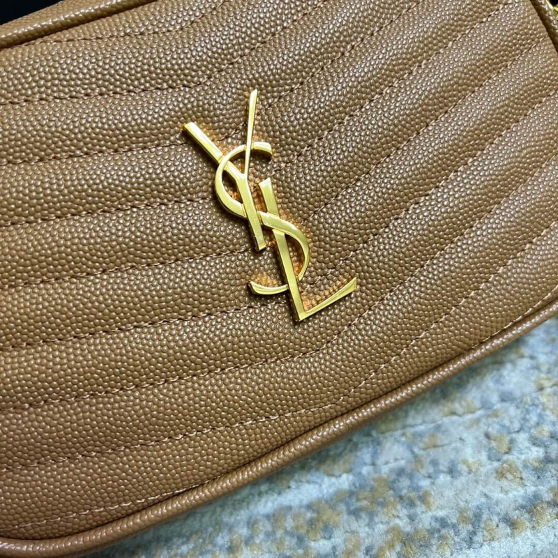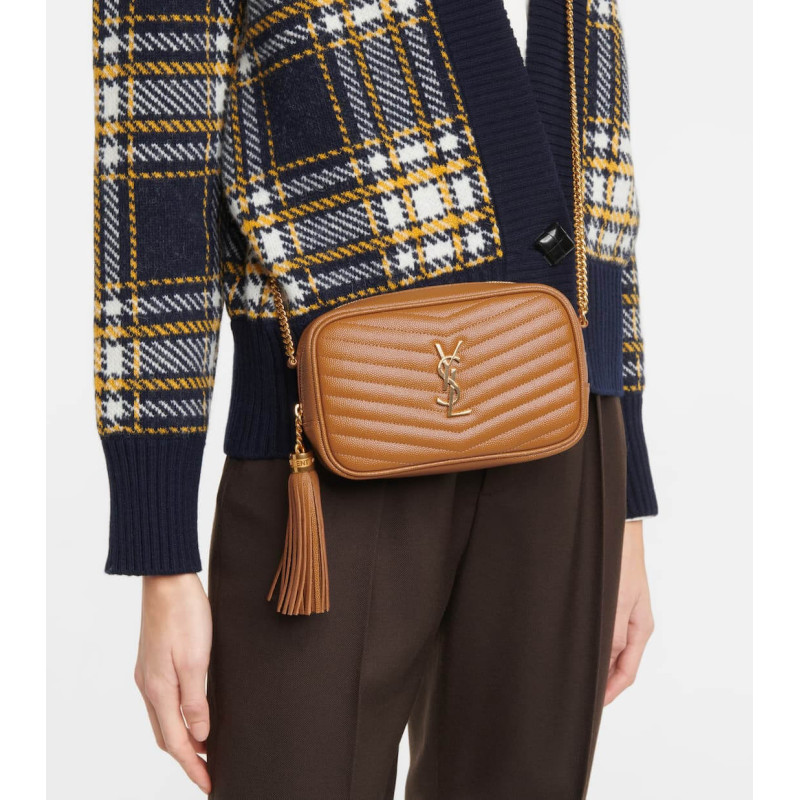 - Saint Laurent "Lou" camera bag in chevron-quilted calf leather with metal YSL monogram on front