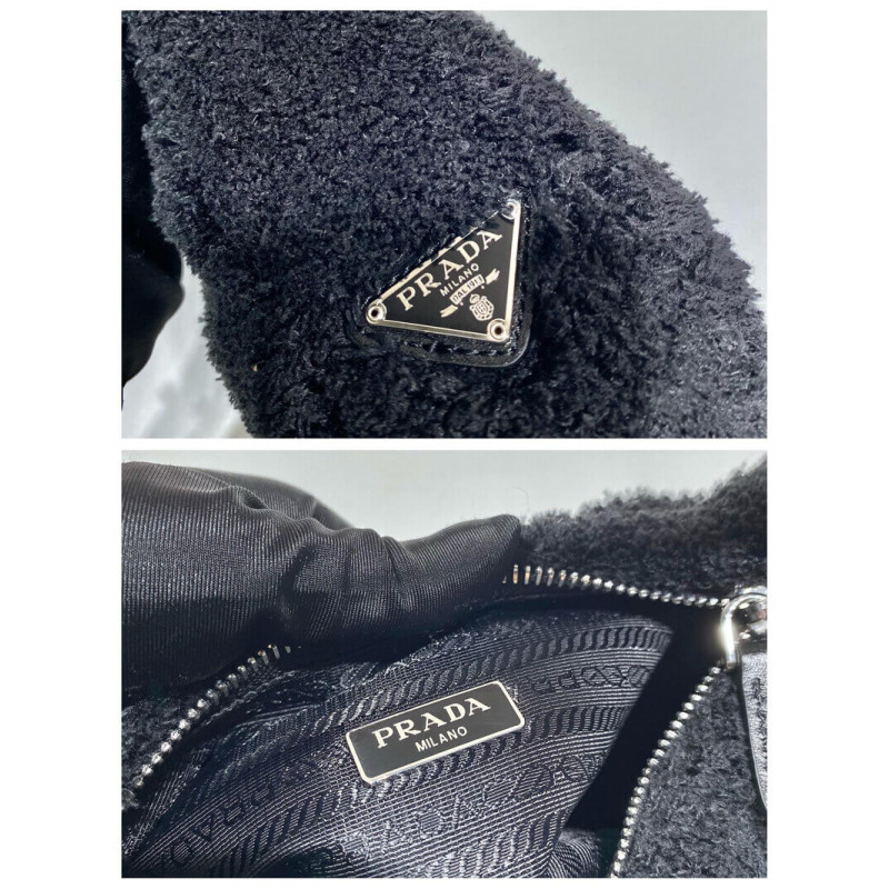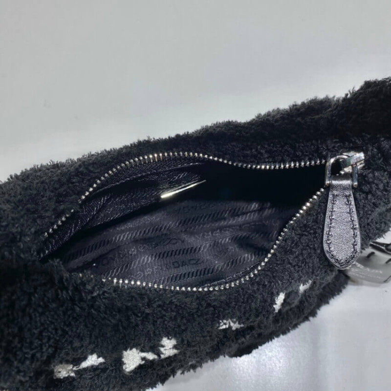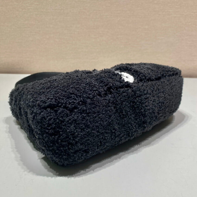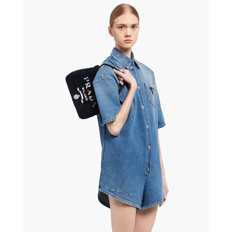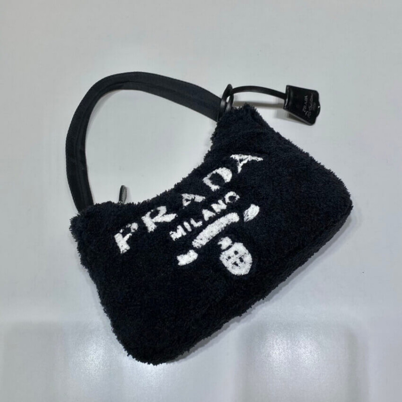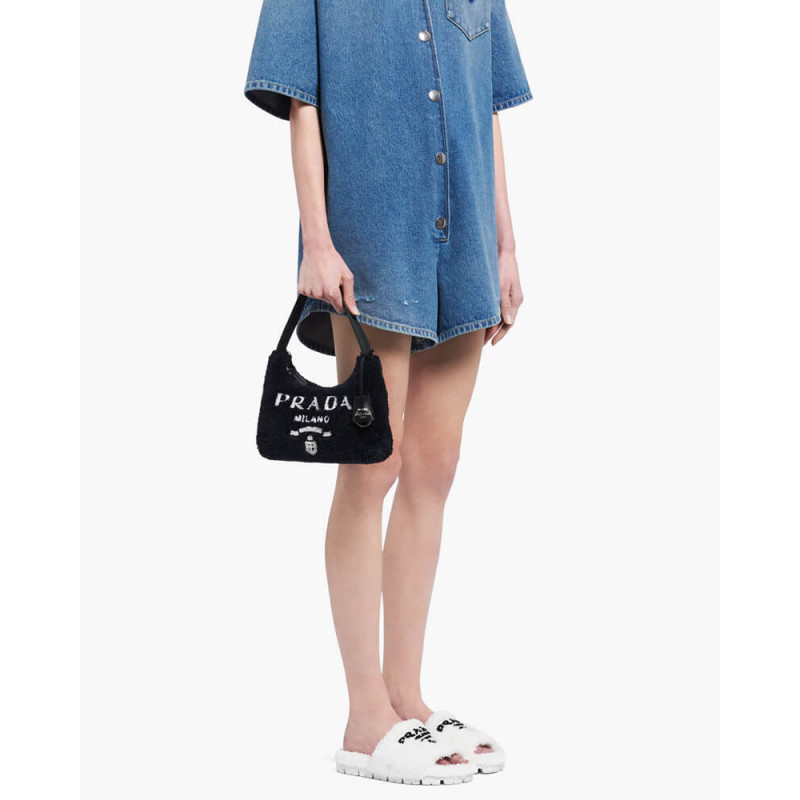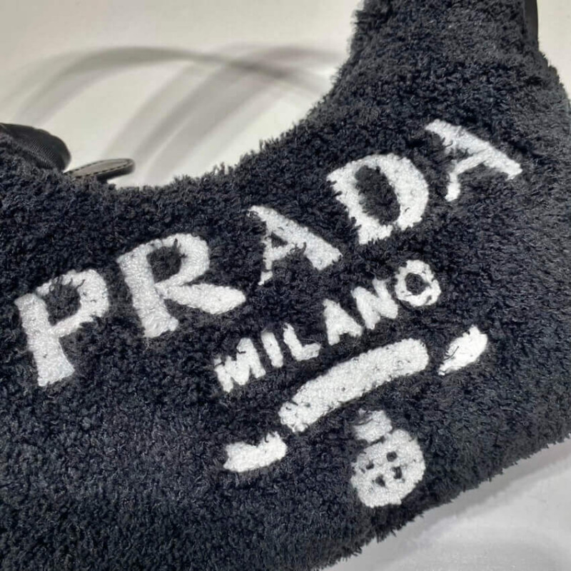 Vivid color contrasts and an ironic character define the Re-Edition 2000 mini hobo bag in soft terry with a summery mood. Prada s iconic lettering logo embroidered on the front embellishes the silhouette, a reinterpretation of a historic style of the brand.