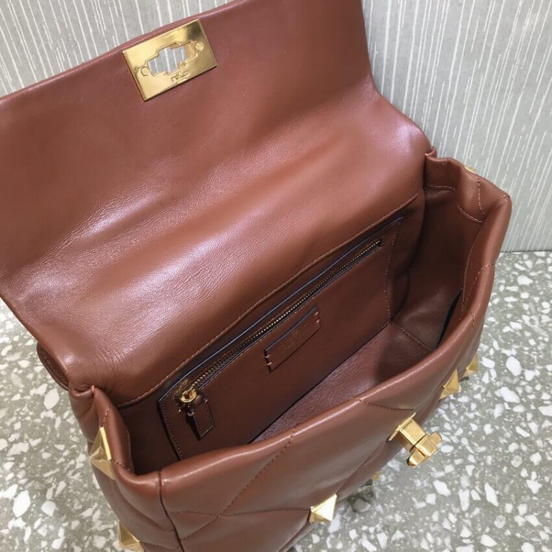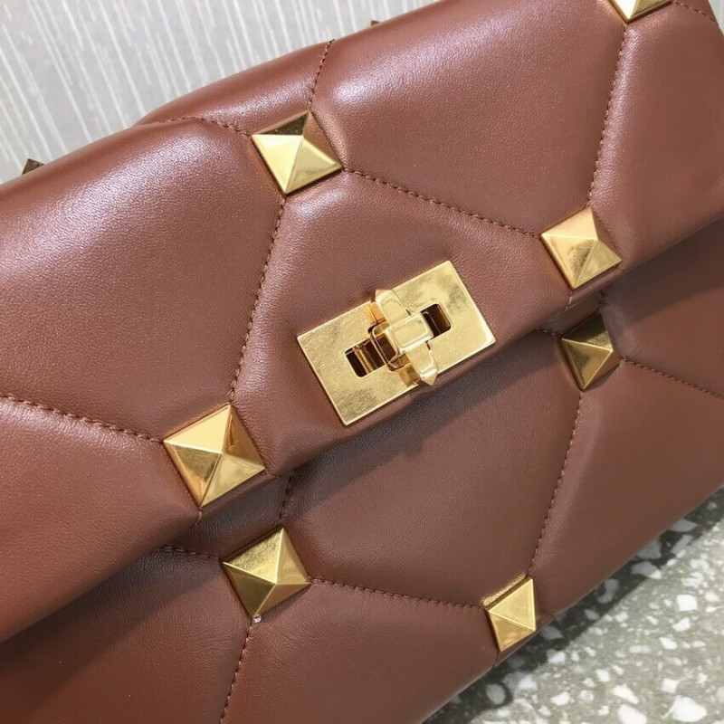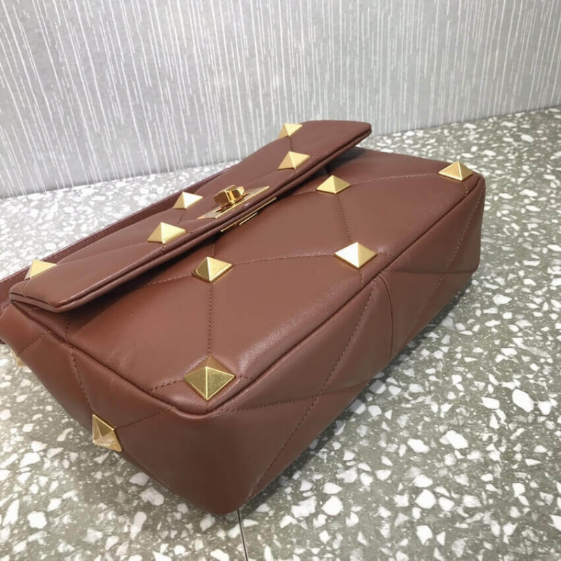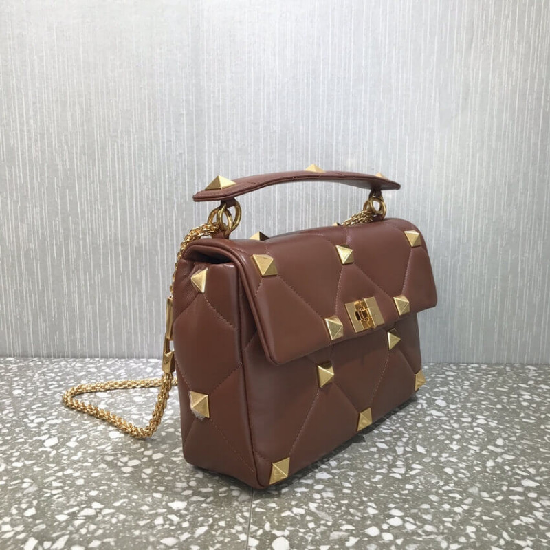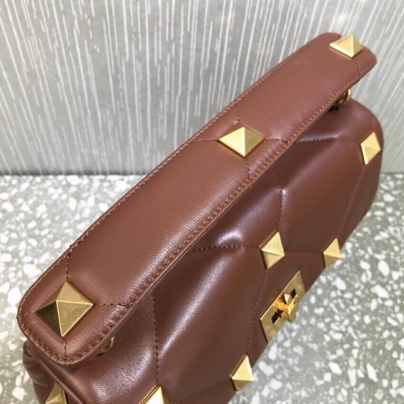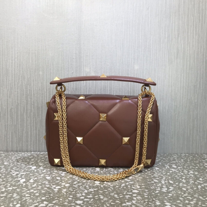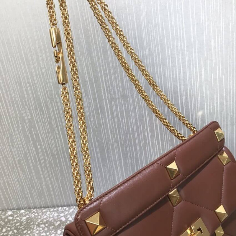Large lambskin nappa Valentino Garavani Roman Stud The Shoulder Bag with chain. Quilted construction and embellished with maxi studs. Equipped with a detachable handle and detachable sliding chain strap, this accessory can be worn as a crossbody/shoulder bag or carried by hand.