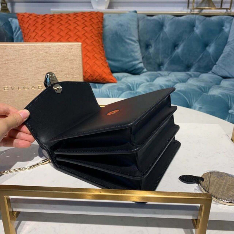 Flap cover bag Serpenti Forever iin Charcoal Diamond Crystal Galuchat Skin and jade green gros-grain lining.Brass light gold plated hardware and snake head closure in black and white enamel with eyes in green malachite.Flap cover bag Serpenti Forever in black calf leather and jade green gros-grain lining. Brass light gold plated hardware and snake head closure in black and white enamel with eyes in green malachite. Top handle model featuring three gussets, with adjustable and removable snake-body shaped chain and leather strap. Small size. Also available in other colours.