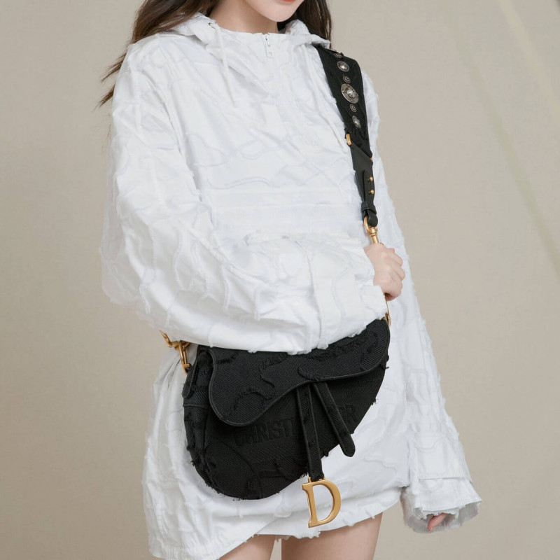 Maria Grazia Chiuri brings a fresh update to the iconic Saddle bag for an eye-catching design. This heritage style showcases the emblematic D -stirrup magnetic clasp and saddle flap with the signature CD structure on both sides of the handle, giving it an instantly modern feel. Made with black hand-cut material and fringe, giving it a Camouflage effect with the Christian Dior signature on the front, this medium style may be customized with alternative straps.