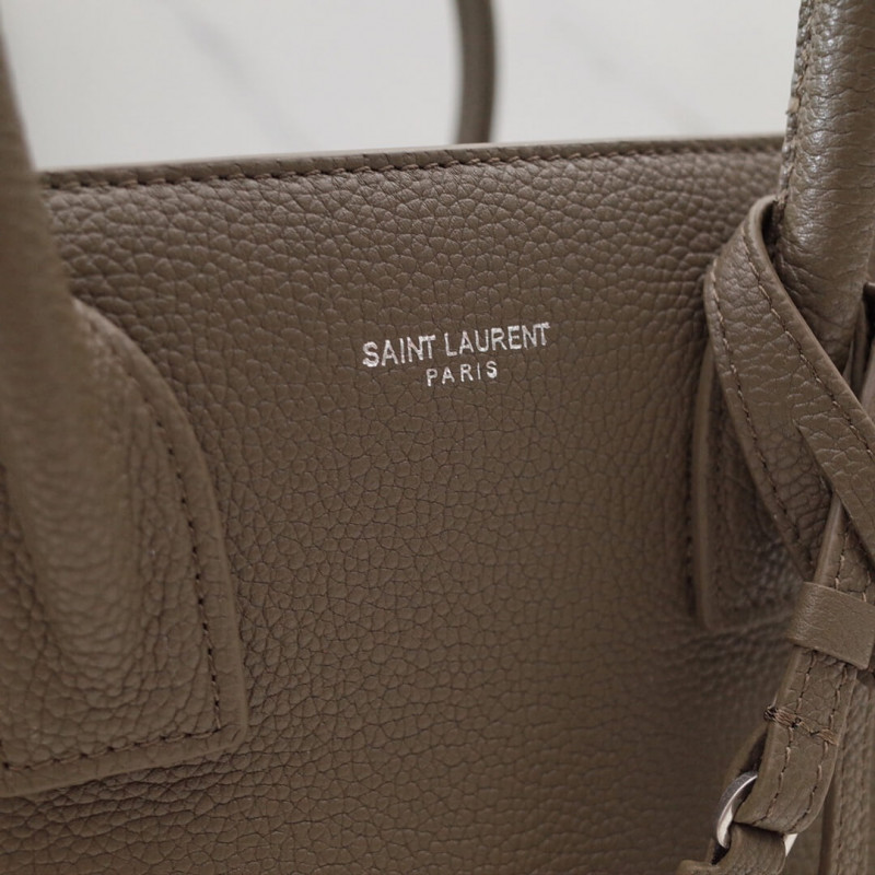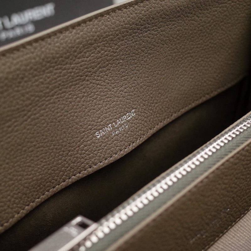 Signature saint laurent bag with soft construction, tubular handles, accordion sides, compression straps with tabs, embossed saint laurent signature and removable, adjustable shoulder strap.