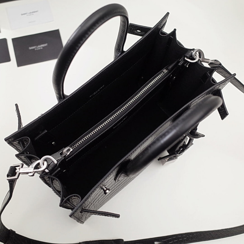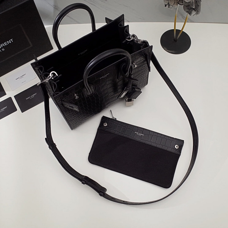 Signature saint laurent bag with soft construction, tubular handles, accordion sides, compression straps with tabs, embossed saint laurent signature and removable, adjustable shoulder strap.