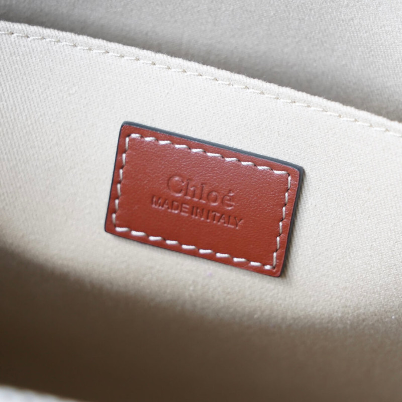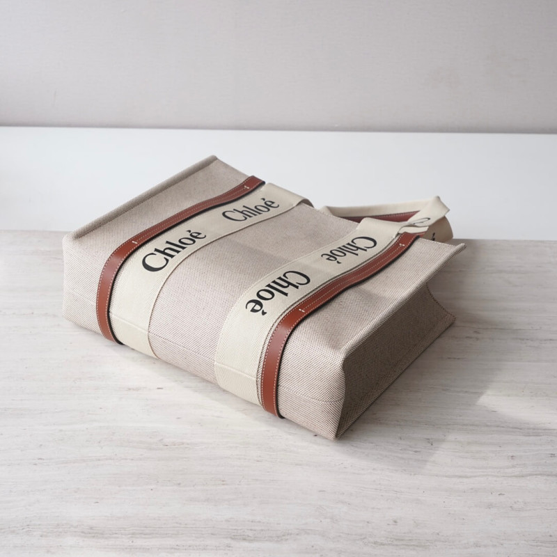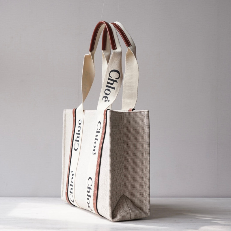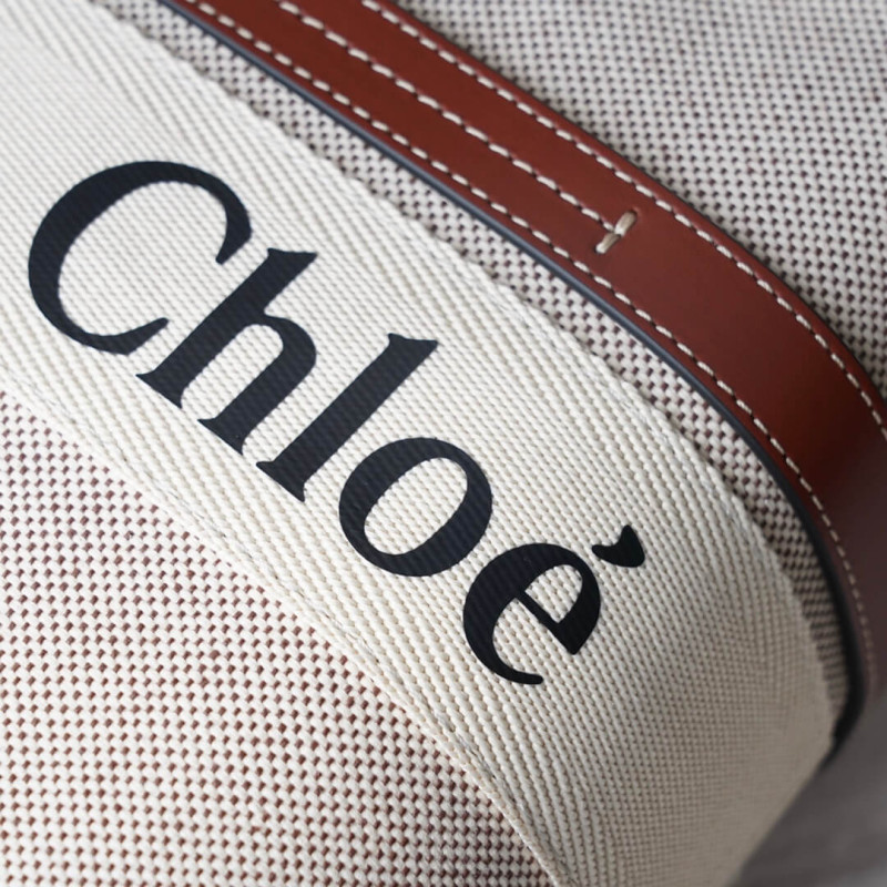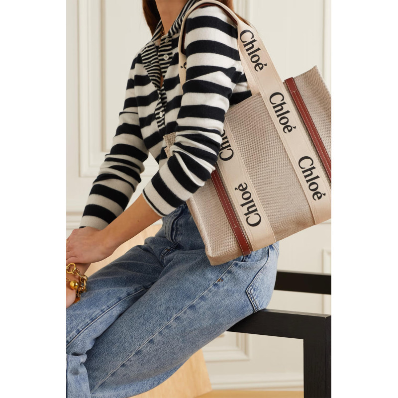 The bag s sharp, modern lines are emphasized by the contrasting vertical leather strips and the signature Chloé logo ribbon in lower-impact linen, carried over from the Maison s Woody mule. Carry this tote bag comfortably on the shoulder.