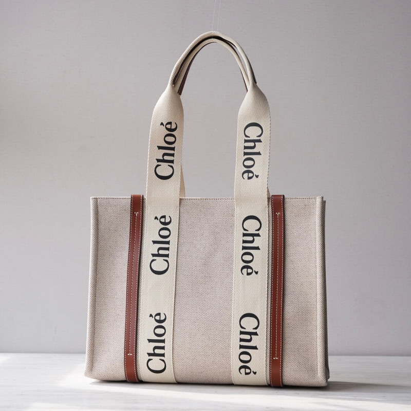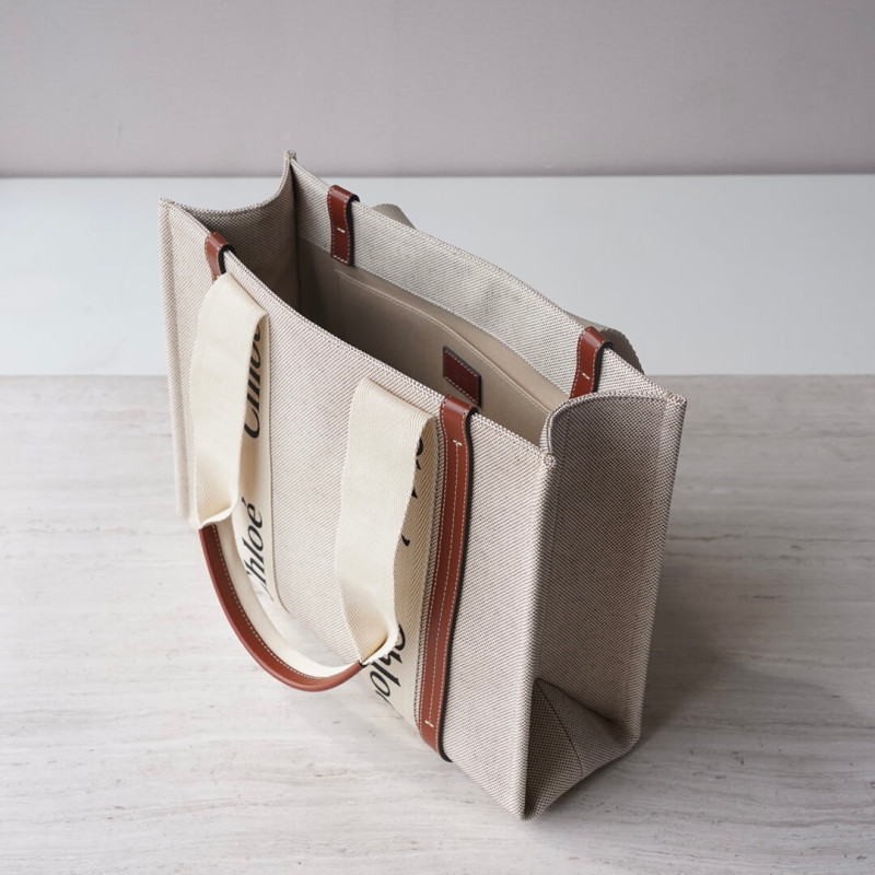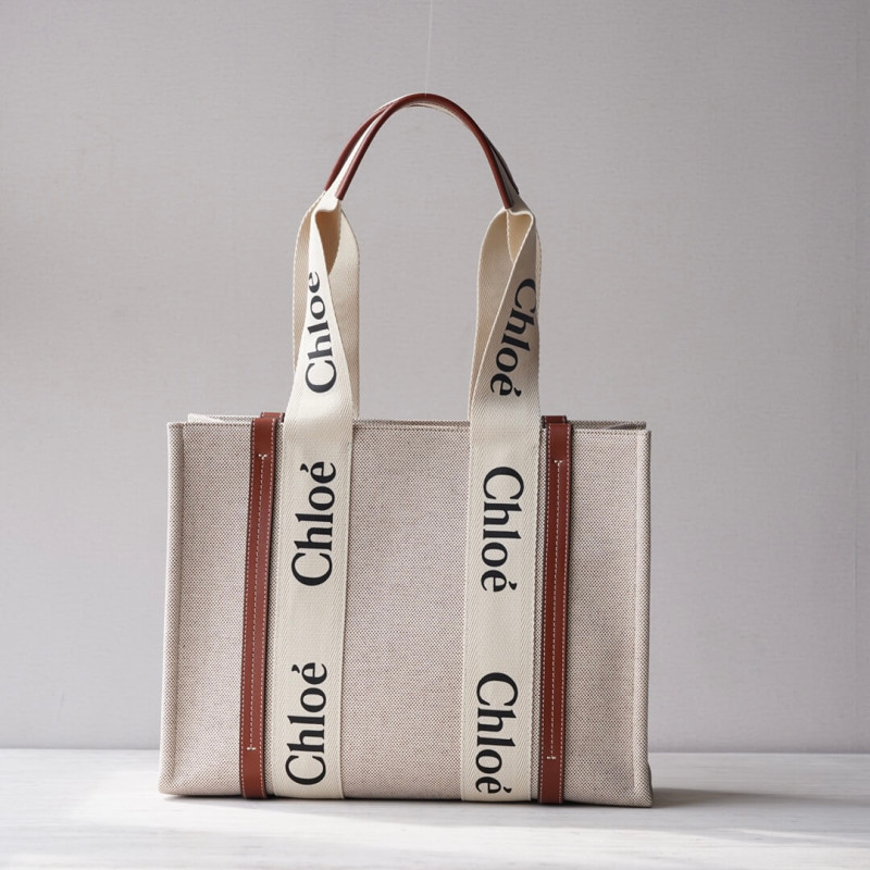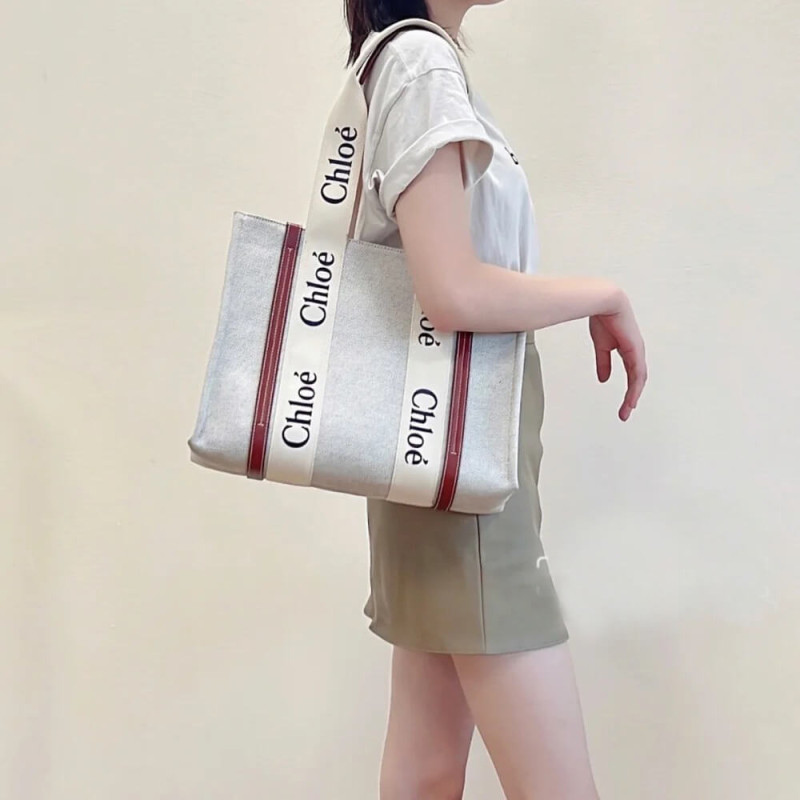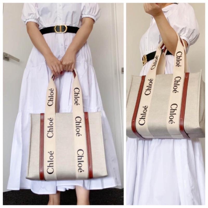 The bag s sharp, modern lines are emphasized by the contrasting vertical leather strips and the signature Chloé logo ribbon in lower-impact linen, carried over from the Maison s Woody mule. Carry this tote bag comfortably on the shoulder.