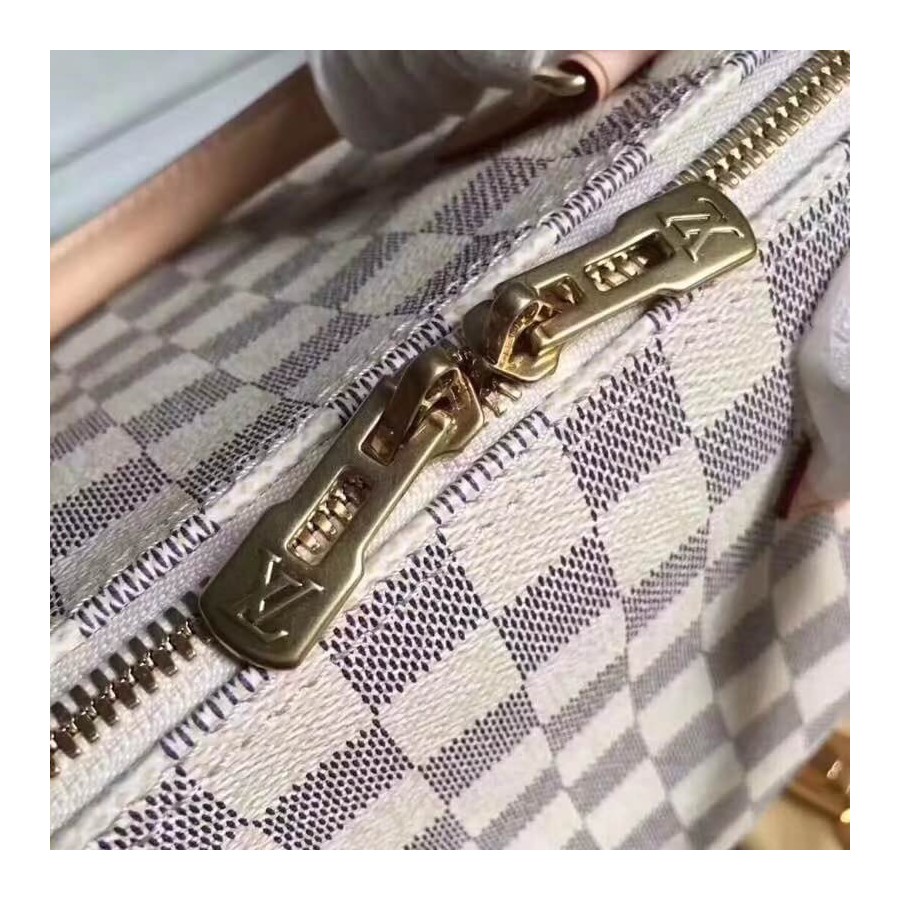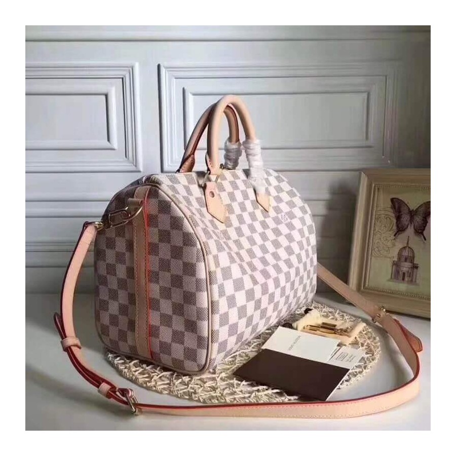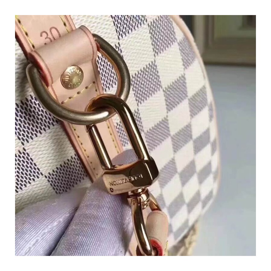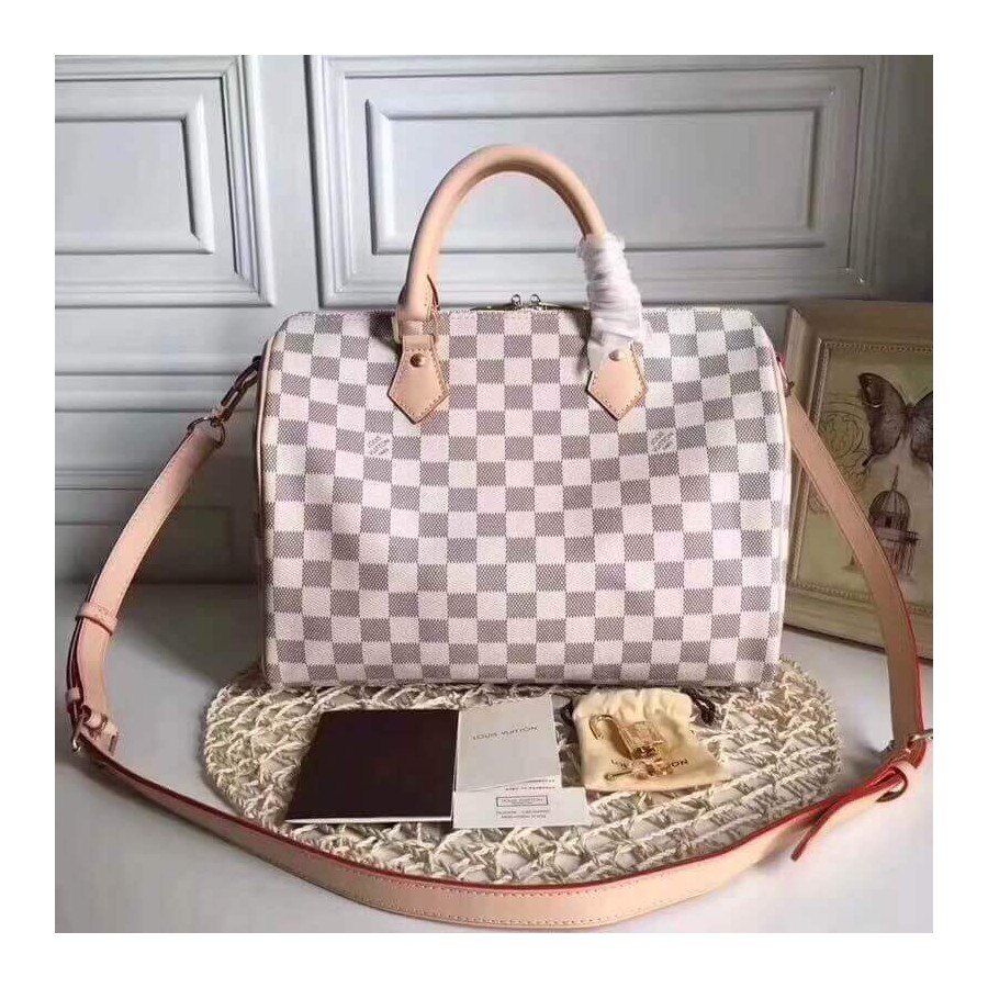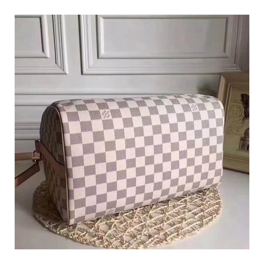 Every feature of this Speedy is iconic: the unique shape, the leather handles, the Damier Azur canvas. No wonder it has achieved cult status the world over. Designed for travelers in 1930 (the name is a nod to the era s rapid transit), with a strap for casual cross-body wear, today s Speedy 30 is a perfect city bag - supple, lightweight and forever in style.