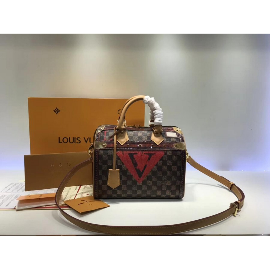 Louis Vuitton s classic Speedy 25 handbag is reinterpreted for Fall-Winter 2018 in distinctive transformed Damier canvas. Trompe l’oeil details and painterly luggage stickers inspired by the House s trunk making heritage add playful accents to an iconic model of the House. Brushed gold-color hardware gives the bag a subtle sheen, while elements such as a double smartphone pocket lend it practicality.