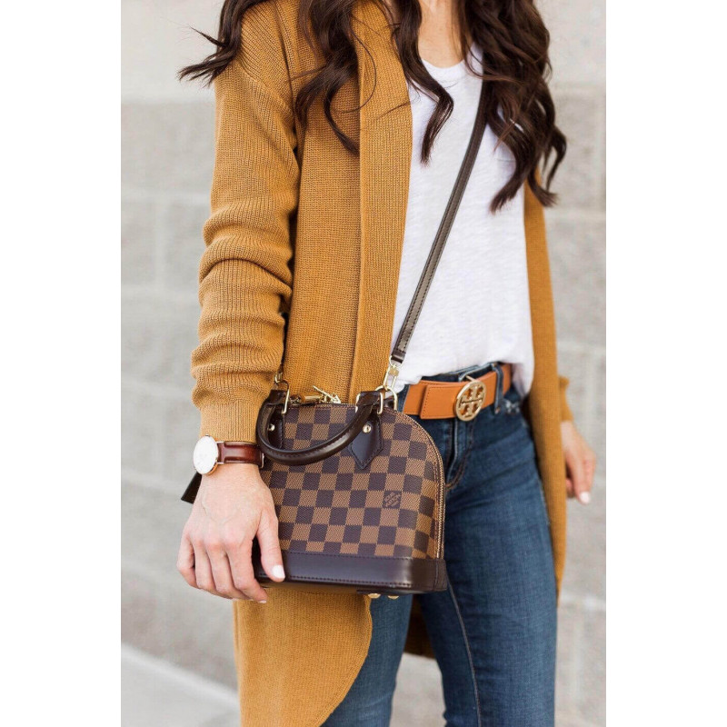 The Alma BB handbag traces its pedigree to the Art Deco original, introduced in 1934. Signature details impart a timeless elegance to this model made from graphic Damier Ebene canvas: note the golden padlock and keys, twin Toron handles and chic leather key bell. Equipped with a removable strap, this charming small bag is perfect for cross-body wear.