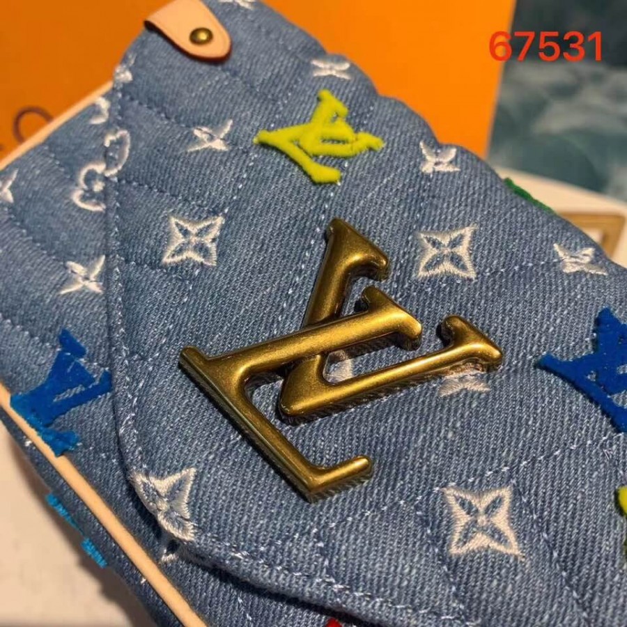 This special edition of the Louis Vuitton New Wave chain pochette is part of the seasonal LV Denim collection. Crafted from washed denim, it is quilted with the line s signature wave pattern and embellished with colorful Monogram embroidery. This wallet is large enough to hold a smartphone, while a zipped pocket protects valuables.