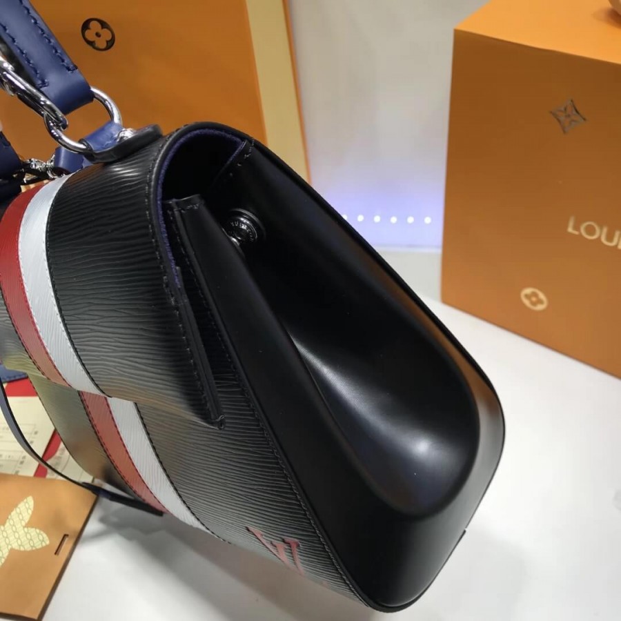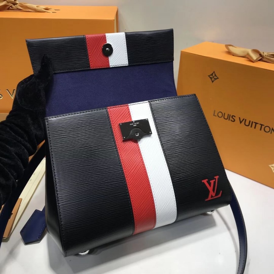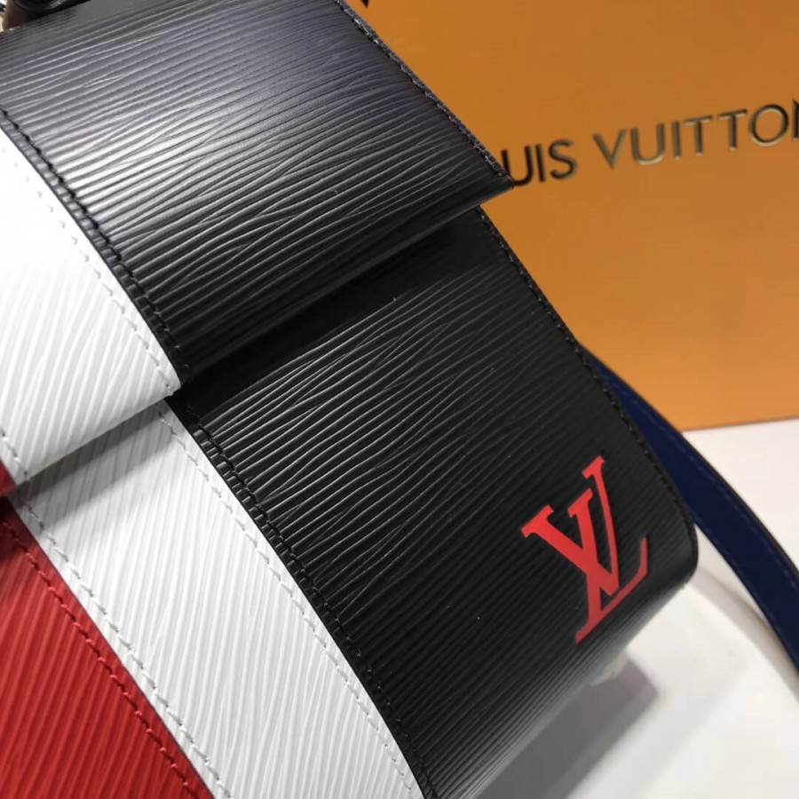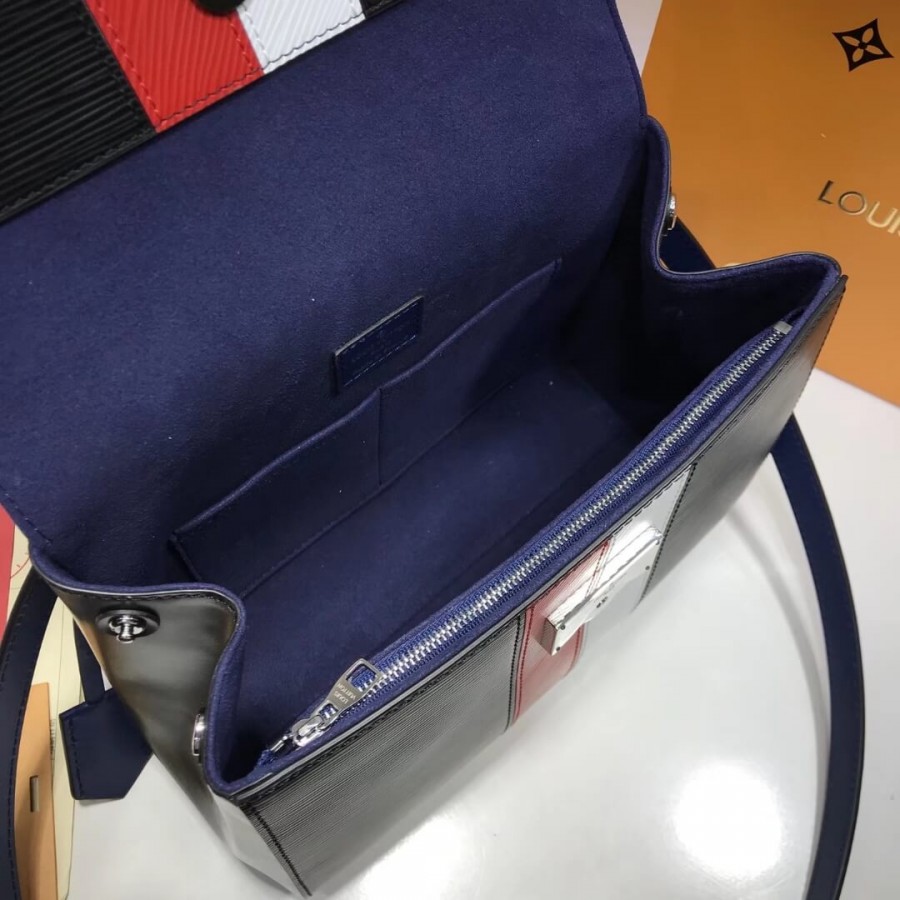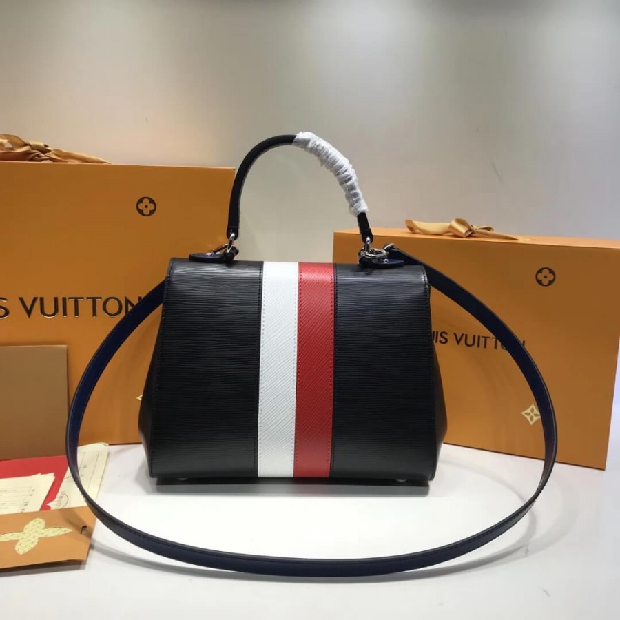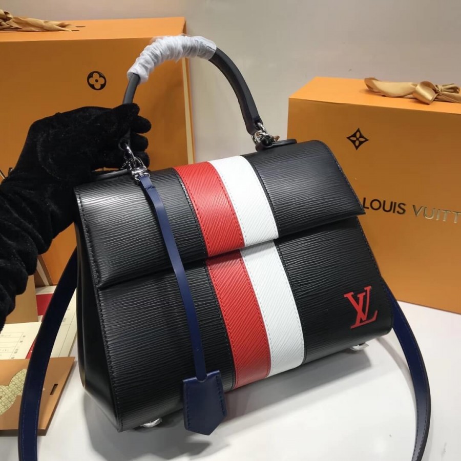 This Cluny BB handbag’s structured silhouette is crafted of grained Epi leather with smooth leather trim and two eye-catching stripes. The two-tone stripe, a theme seen on shoes at the Fall 2018 Collection, is a nod to the House’s tradition of personalizing its historic trunks. Silver-tone hardware pairs with colorful touches to complete this bag’s distinctive look.
