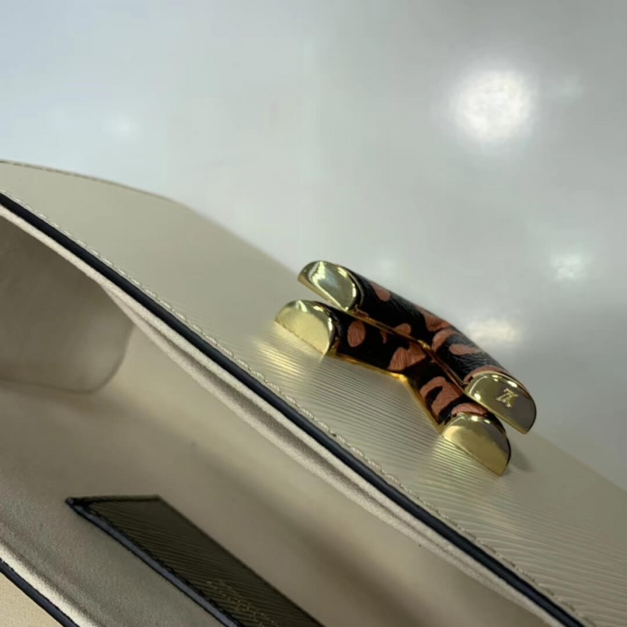 For the LV Jungle collection of accessories and leather goods, the iconic Twist MM handbag is given a new look. It combines Quartz Epi leather with leopard-print canvas. The signature lock of the Twist with an L that transforms into a V - is playfully revisited with this graphic motif.