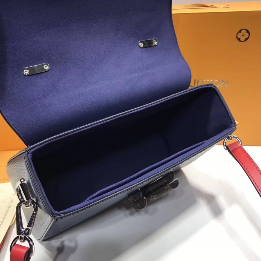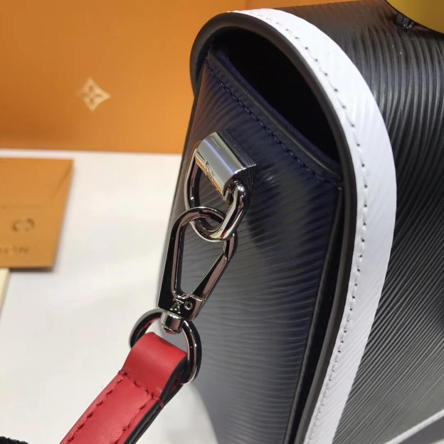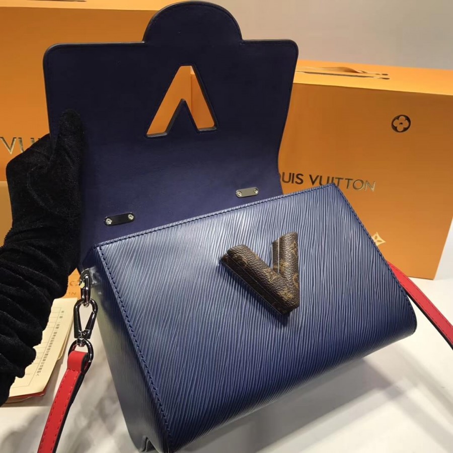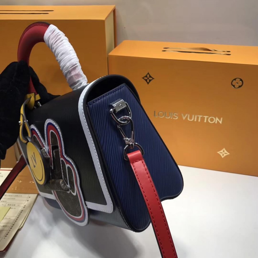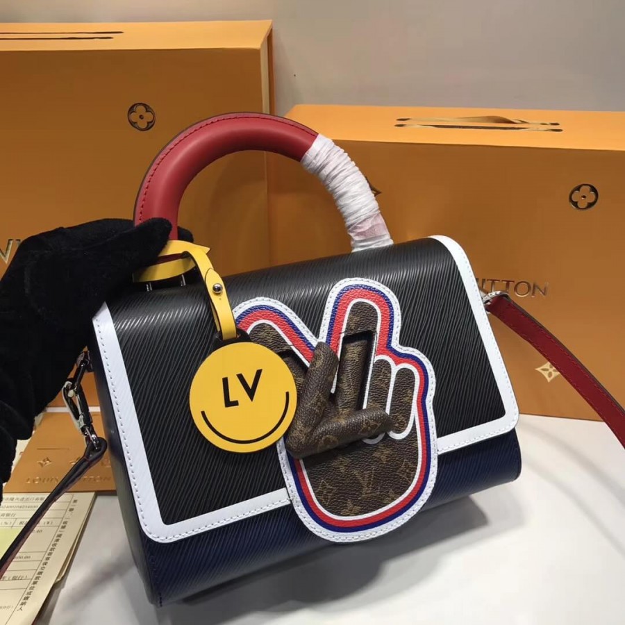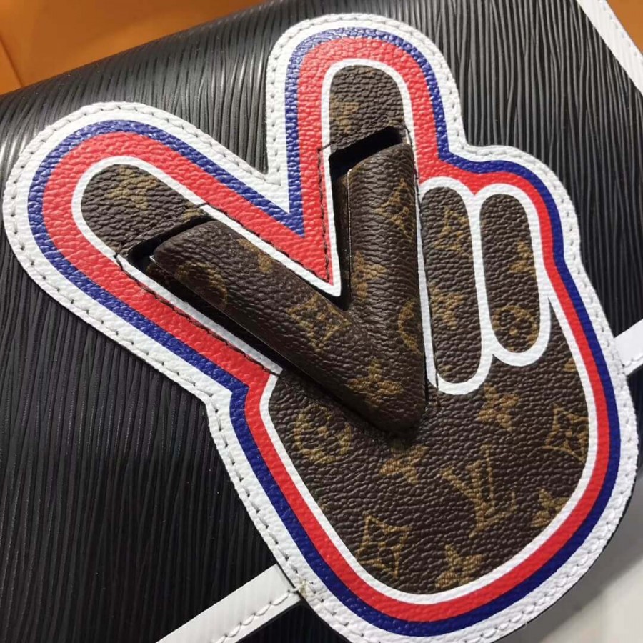 V for Vuitton morphs into a peace symbol on this Twist MM handbag. The motif is crafted from Mini Monogram canvas, which also covers the LV Twist lock, for a fun, trompe-l’oeil effect against the colorful Epi leather. The satchel handle, a nod to “back to school” days, is accented with a leather LV charm.