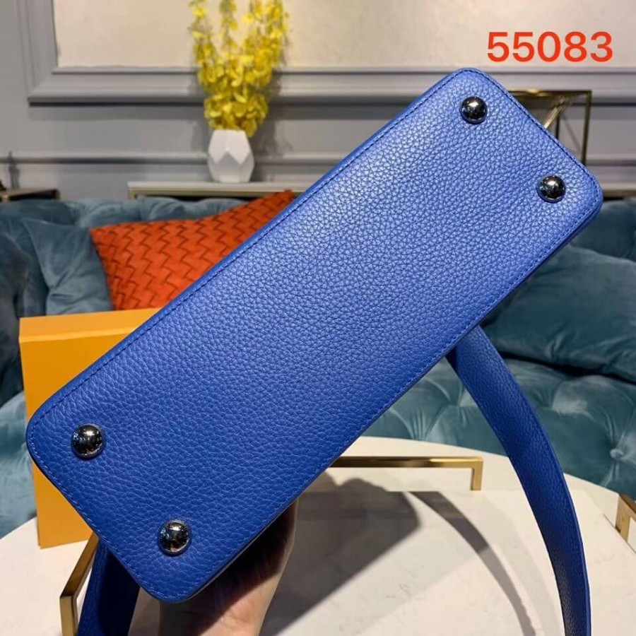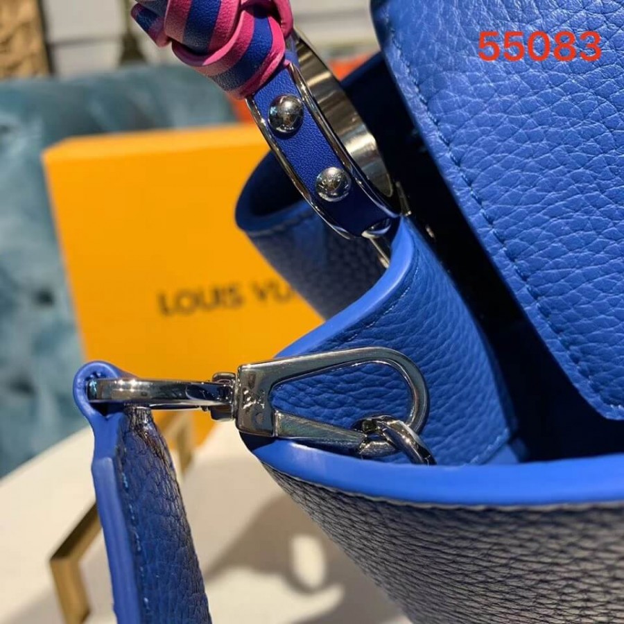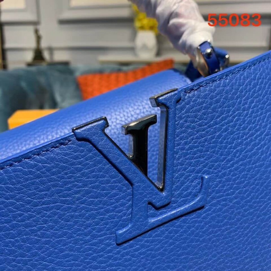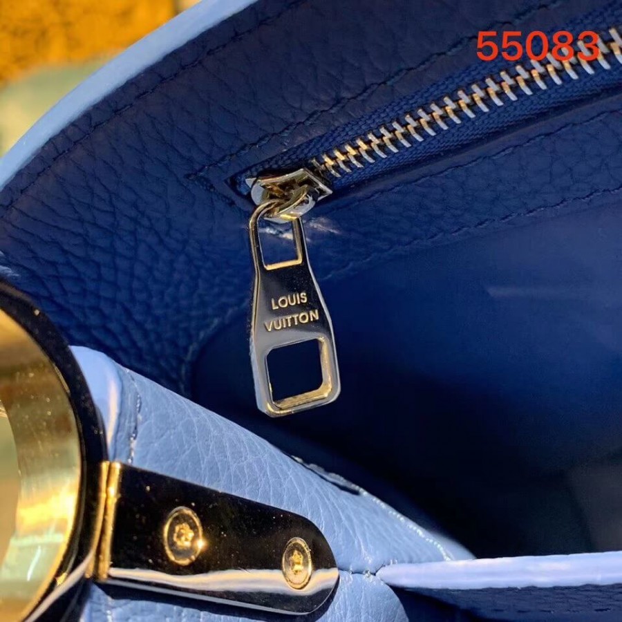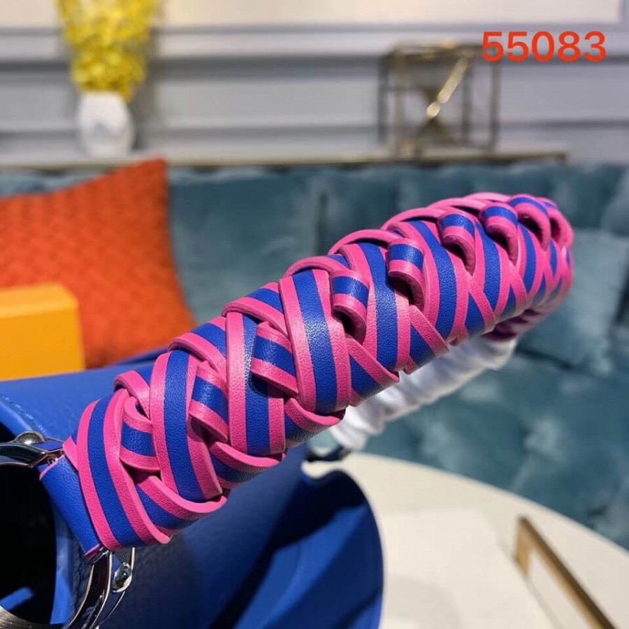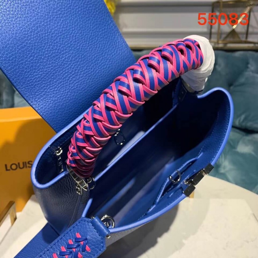 For Fall 2019, the Capucines PM handbag is made from Taurillon leather and features a braided handle of contrasting colored leather threads. This light, sophisticated bag can be worn in a host of ways: over the shoulder or on the elbow, cross-body, with the flap out or tucked inside to display the distinctive covered LV Initial signature.
