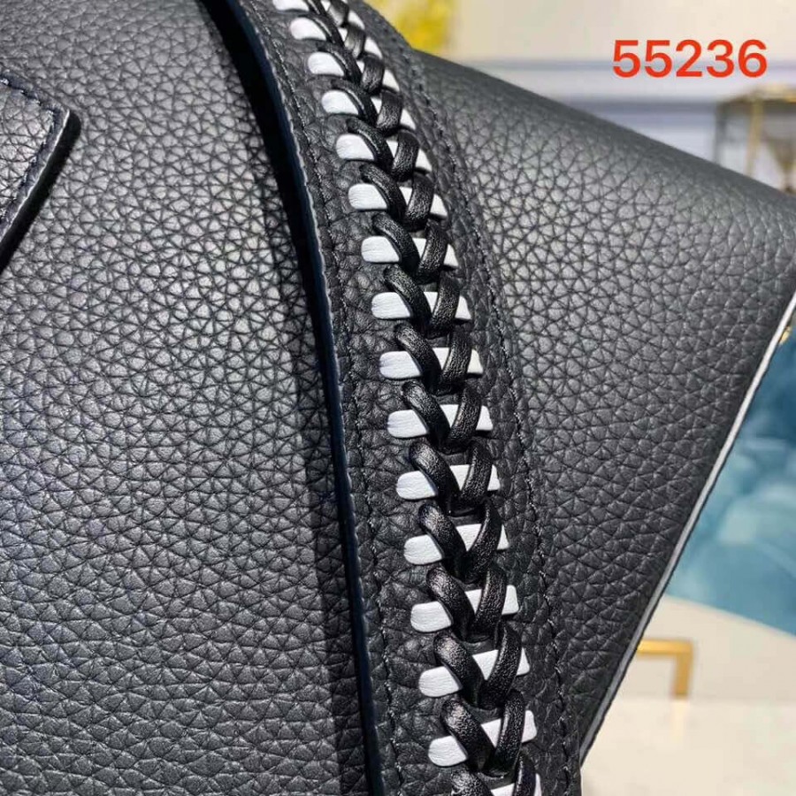 The youthful Capucines BB handbag in supple Taurillon leather takes a playful feel with its braided handle and strap. Made of contrasting leather threads, the braid bring an arts and crafts feel to this iconic bag for Fall 2019. The bag can be carried with the flap out or tucked inside to reveal the silver-color LV Initials.