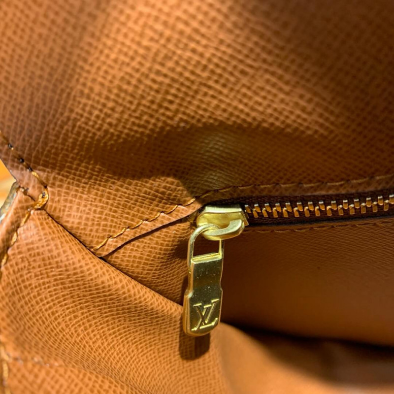 This chic cross body bag features iconic monogram toile canvas and vachetta cowhide leather trim including an adjustable cross body shoulder strap. A strap closure for the rounded front flap unbuckles to a brown fabric interior with a zipper pocket.