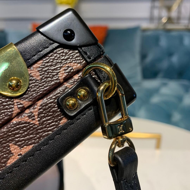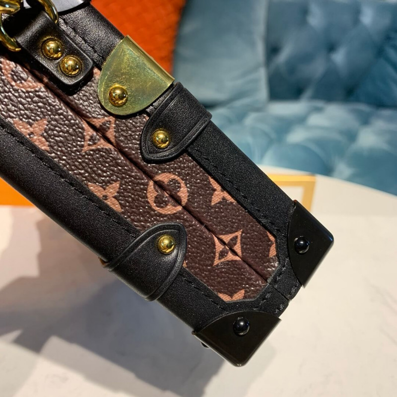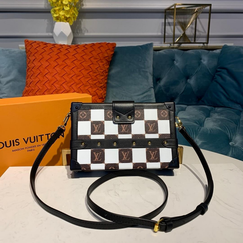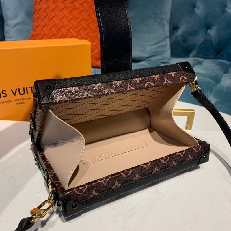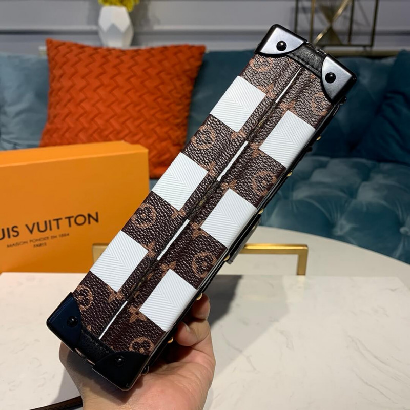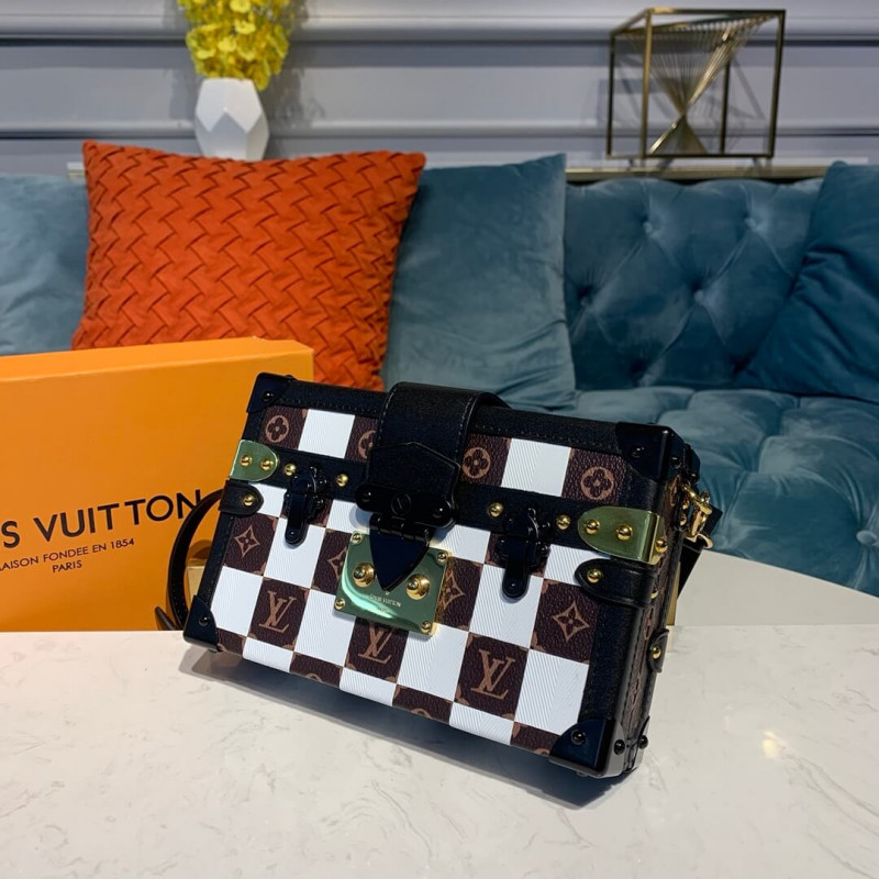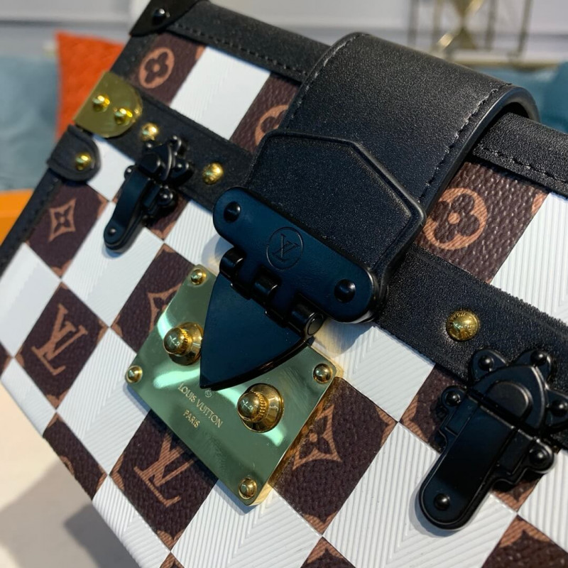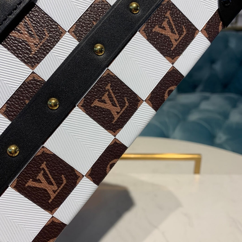 The Damier Tressage Petite Malle handbag is an elaborately crafted design paying tribute to Louis Vuitton s heritage. Monogram or Monogram Reverse on black version canvas and supple calf leather are interwoven to create a graphic check pattern evoking Damier canvas. This miniature interpretation of one of the House s historic trunks is secured by an iconic S-lock clasp.