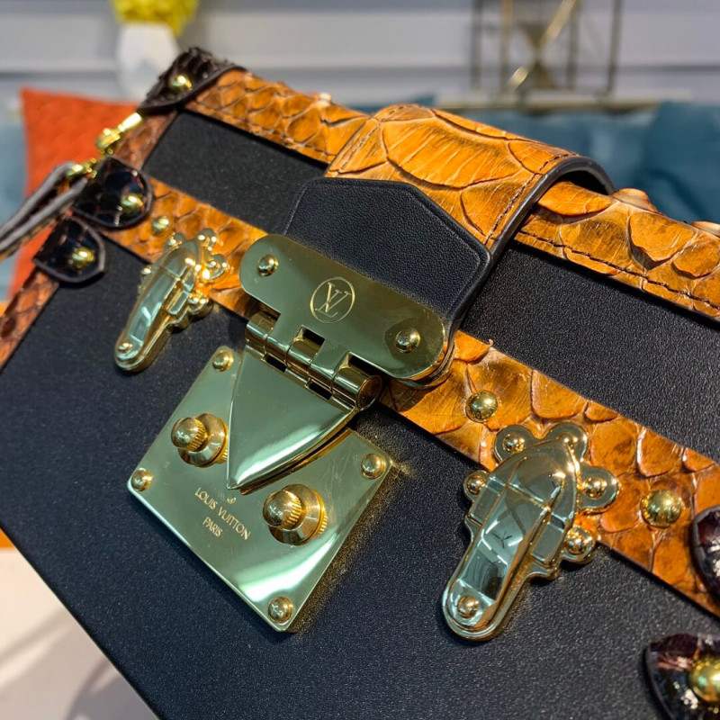For Fall 2018, the exquisite Petite Malle handbag is crafted from black calf leather with exclusive exotic python-leather trim and a gold-color S-lock clasp. A sophisticated yet practical small bag perfect for evening use, it is Nicolas Ghesquière’s vision of the House’s original trunks and the spirit of travel they represented. The removable leather strap enables two carry options: clutch or cross-body.