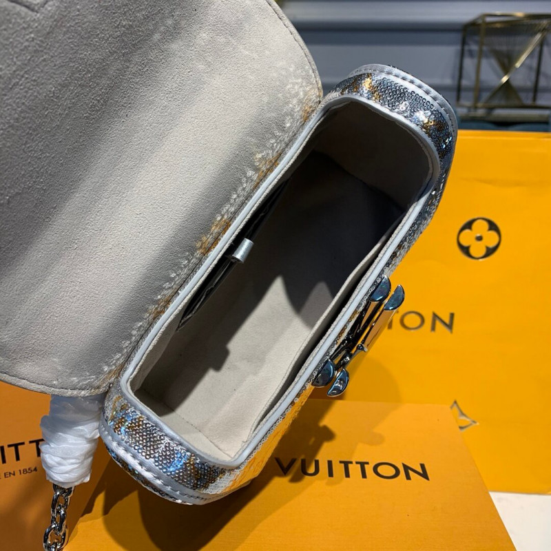 This exceptional edition of the emblematic Twist PM handbag combines Louis Vuitton s leather-goods craftsmanship with couture techniques. Smooth leather is densely embroidered with silver and gold-tone sequins to create a shimmering Monogram pattern. When this glamorous bag catches the light, the effect is mesmerizing.