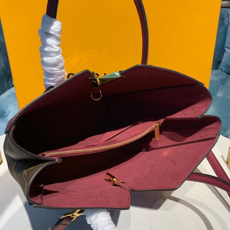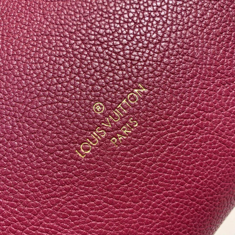 This tote is crafted of Louis Vuitton monogram canvas with an overlapping layer of rich calfskin leather in red. The shoulder bag features rolled leather top handles, an optional red shoulder strap and a polished brass Louis Vuitton "V" embellishment reminiscent of the Japanese Kimono robes. The top is open to a partitioned red suede interior with a central zippered compartment and pockets.