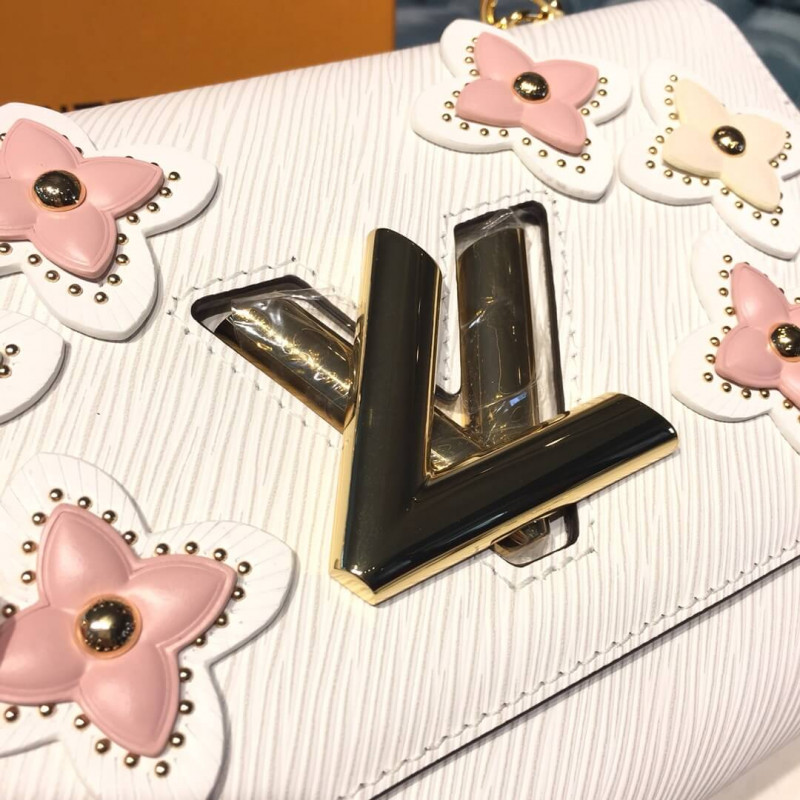 Louis Vuitton Couture’s Flower Tinsel theme comes to the Twist MM handbag for Spring-Summer 2019. The bag features Flowers made of studs and layered leather, reinterpreting the emblematic monogram pattern, and complementing nicely the black Epi leather: a subtle nod to the rivets found on Louis Vuitton’s iconic trunks.