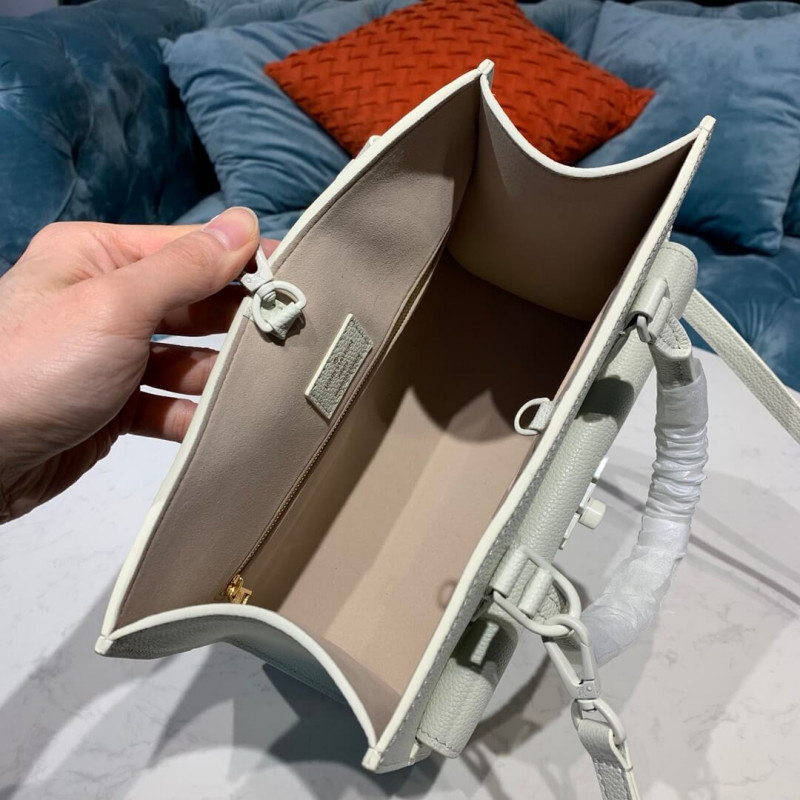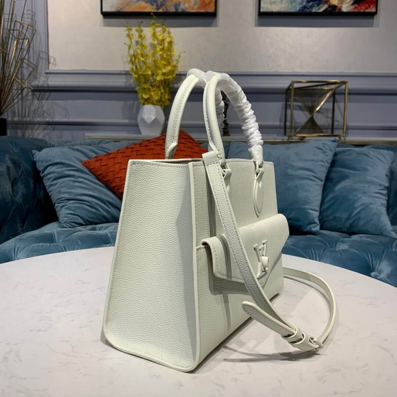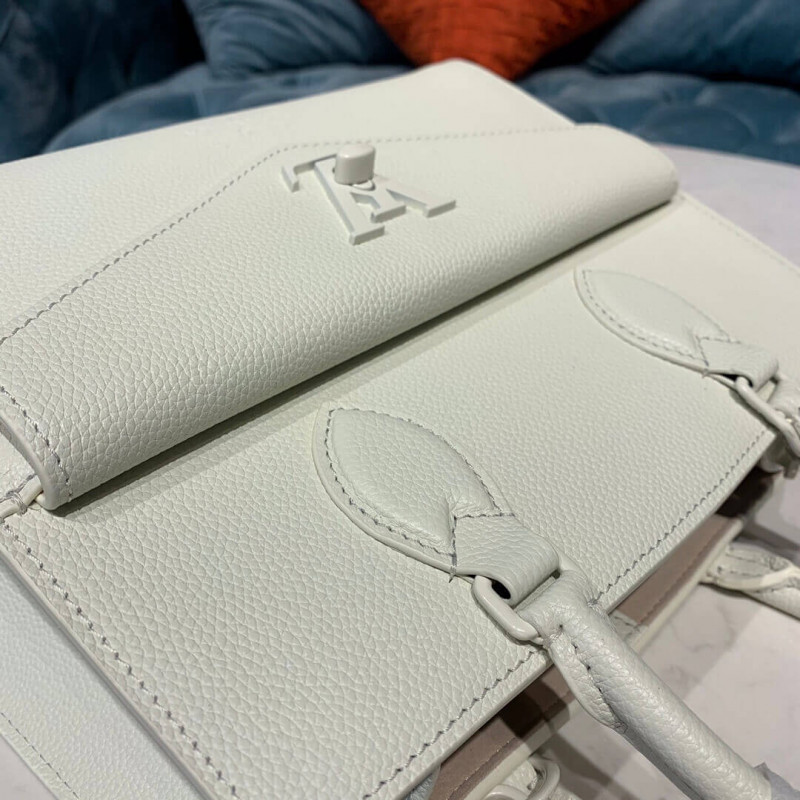 Timeless design and modern functionality unite in the Lockme Monochrome Tote PM. Fashioned from soft grained calf, this bag gets its stylish edge from the tone-on-tone LV turn lock and hardware. A refined choice for everyday wear, this model offers multiple carry options thanks to the signature Toron top handles and an adjustable, detachable shoulder/cross-body strap.