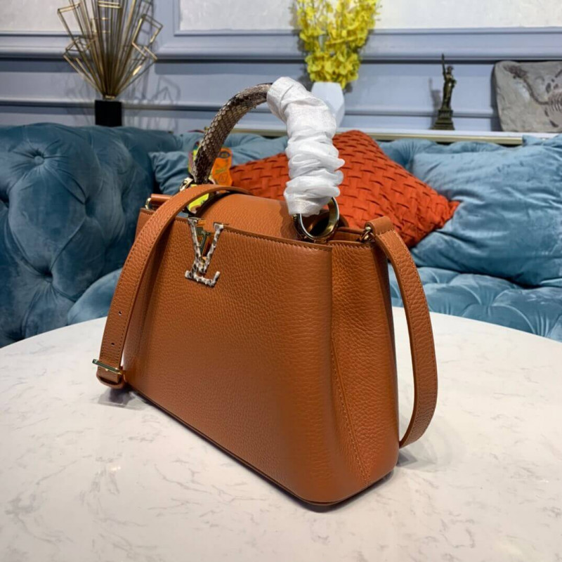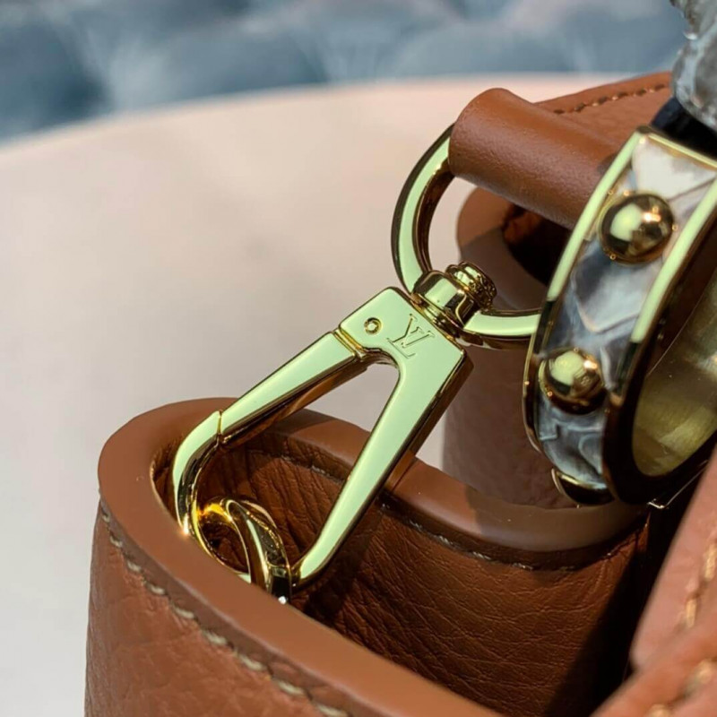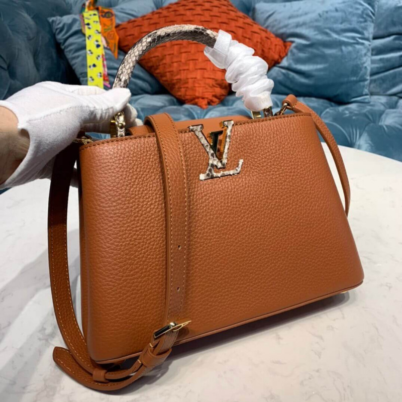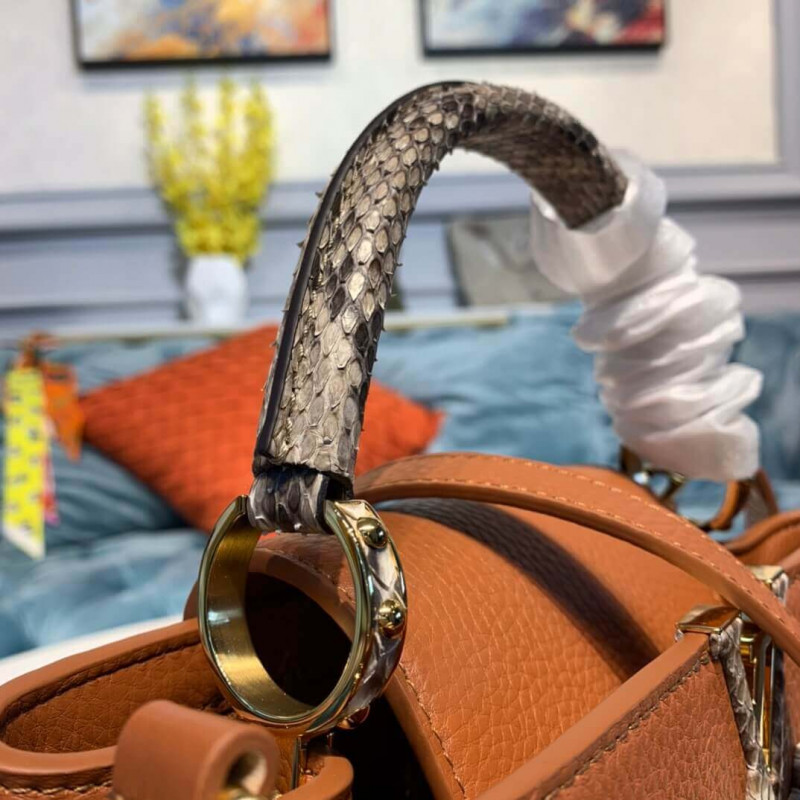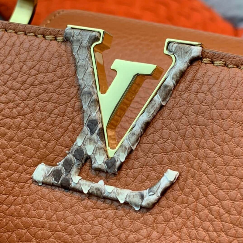 The Capucines BB handbag in full-grain Taurillon leather is accented with a handle and a LV signature fashioned from natural python skin. The sophisticated combination of materials perfectly complements the bag’s iconic lines. As with all the Capucines, the bag can be worn with the flap inside or out.
