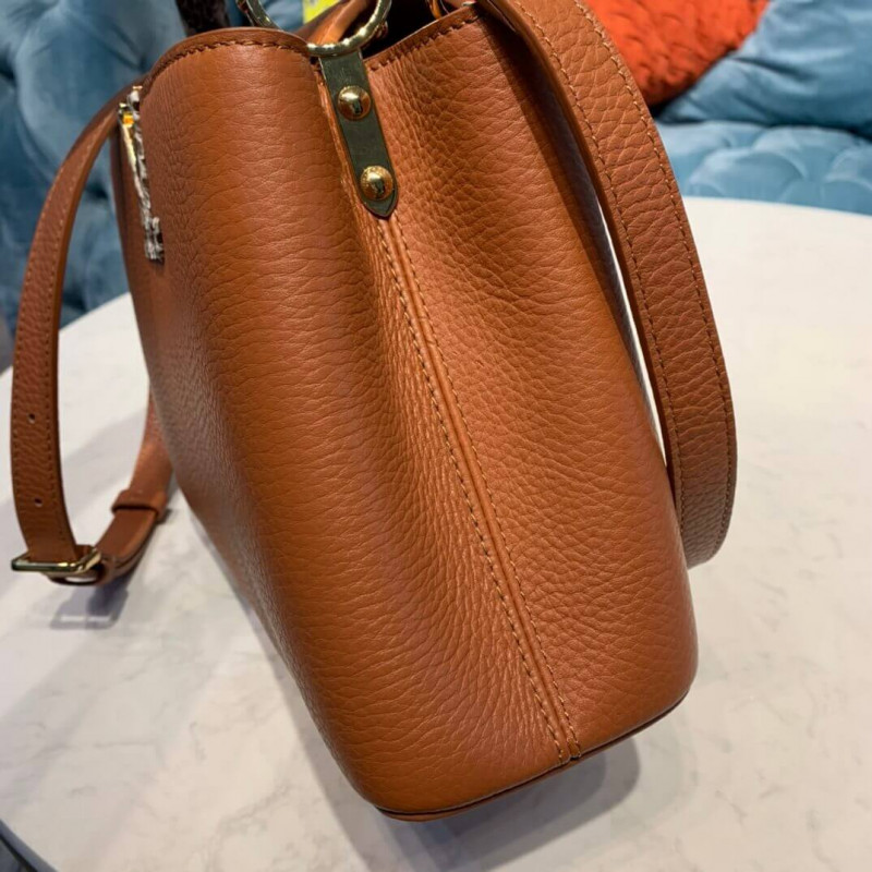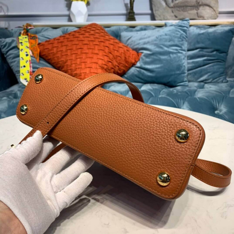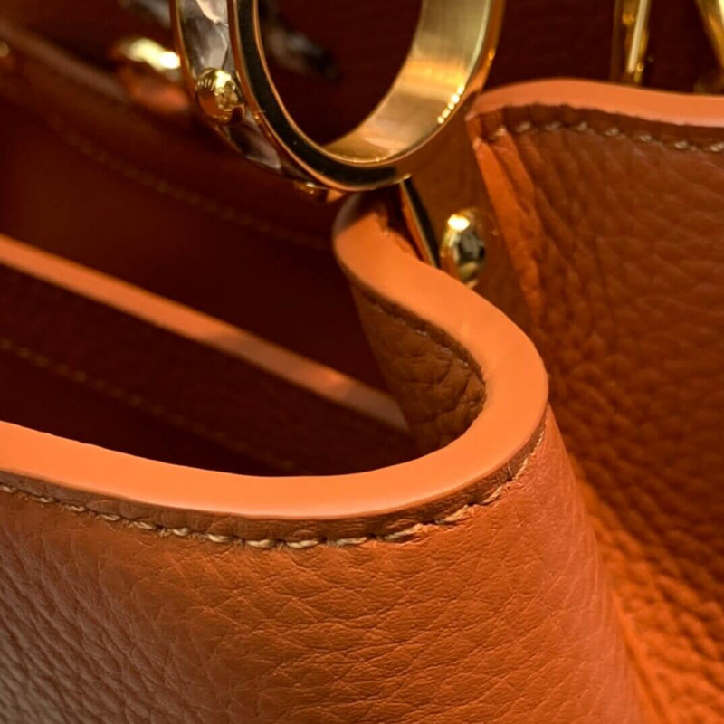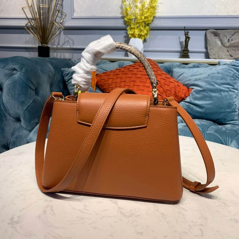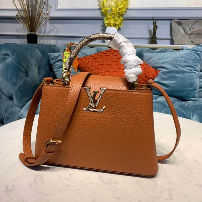 The Capucines BB handbag in full-grain Taurillon leather is accented with a handle and a LV signature fashioned from natural python skin. The sophisticated combination of materials perfectly complements the bag’s iconic lines. As with all the Capucines, the bag can be worn with the flap inside or out.