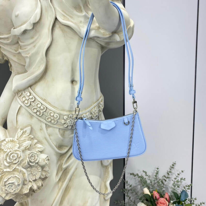 The Easy Pouch on Strap is a sleek design in grained Epi leather, discreetly embossed with the LV Initials. Large enough to hold everyday essentials, this on-trend model is notable for its versatility, featuring a removable chain and a removable, adjustable leather strap for shoulder or cross-body carry. The D-ring on the outside can be used to attach a charm.