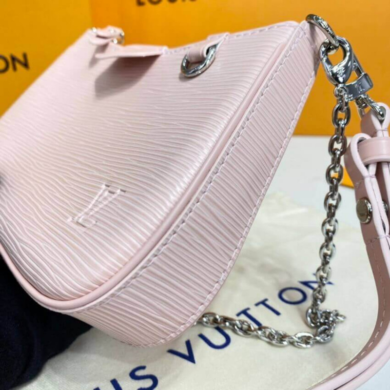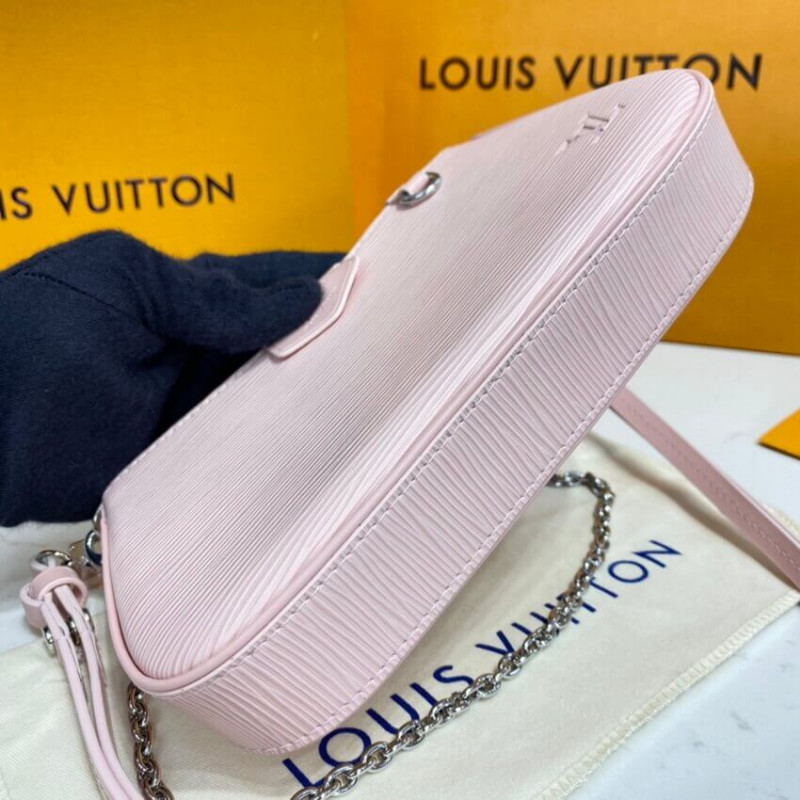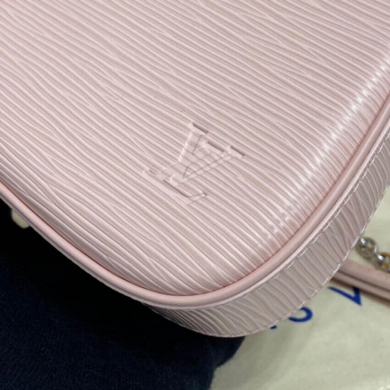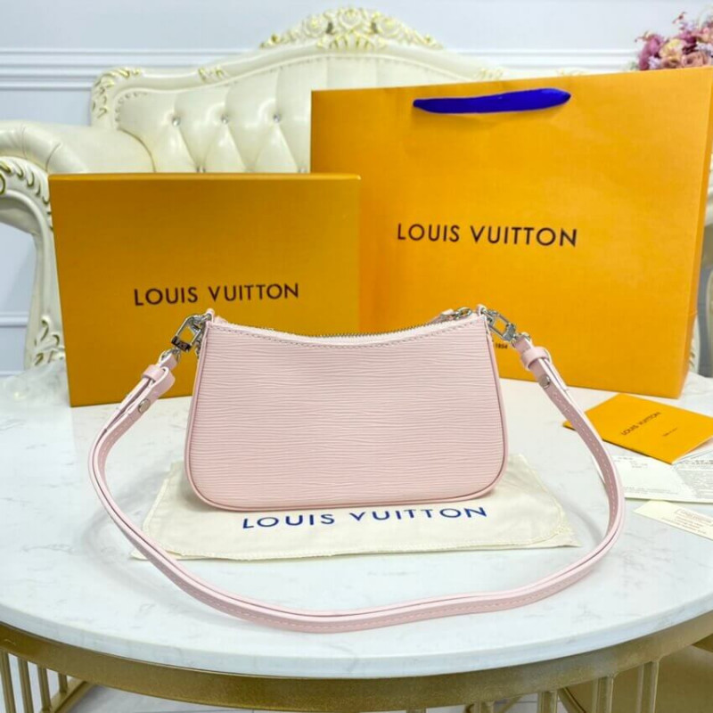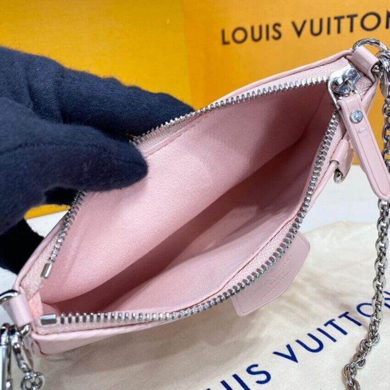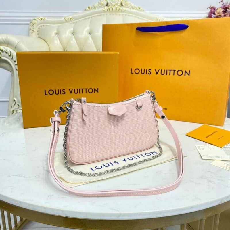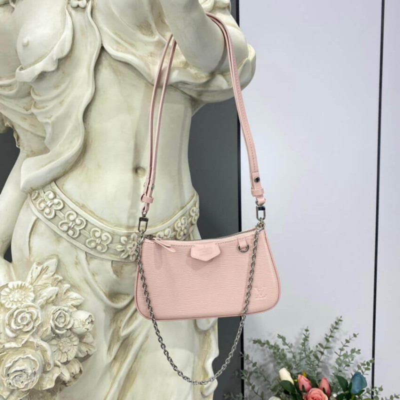 The Easy Pouch on Strap is a sleek design in grained Epi leather, discreetly embossed with the LV Initials. Large enough to hold everyday essentials, this on-trend model is notable for its versatility, featuring a removable chain and a removable, adjustable leather strap for shoulder or cross-body carry. The D-ring on the outside can be used to attach a charm.