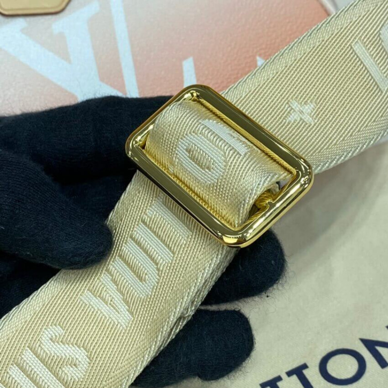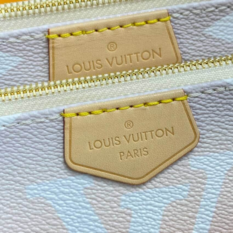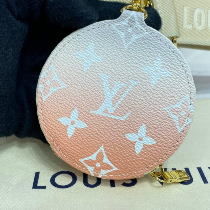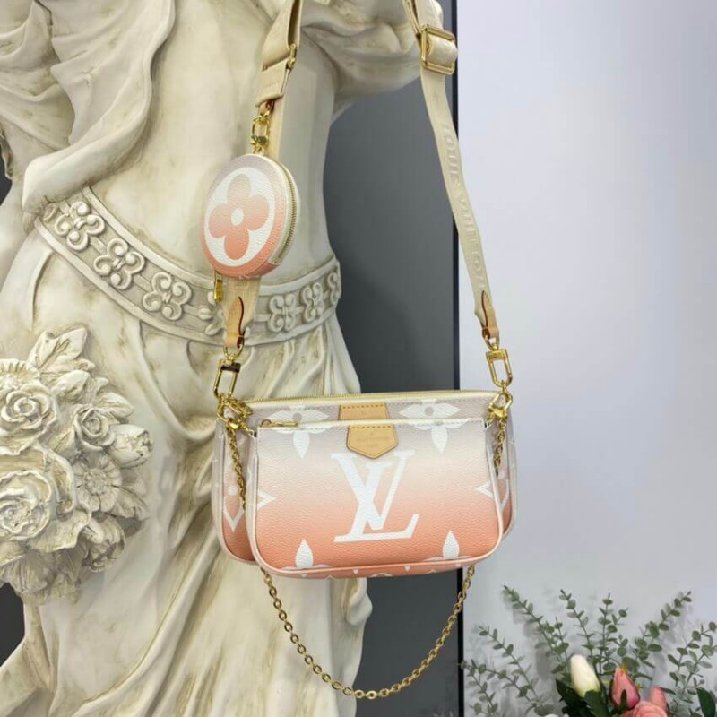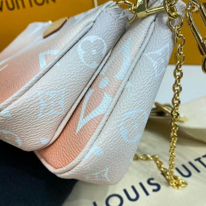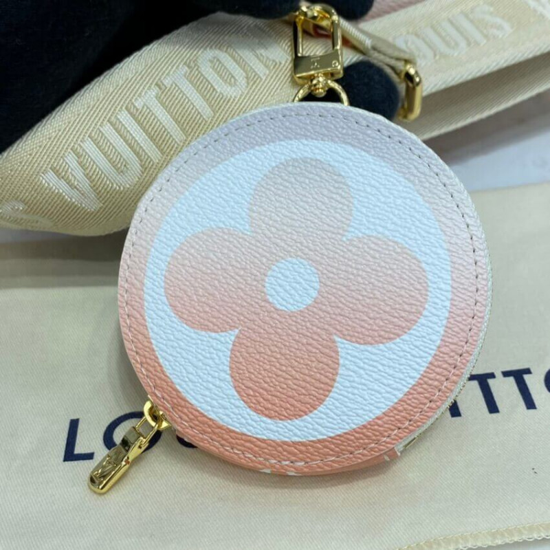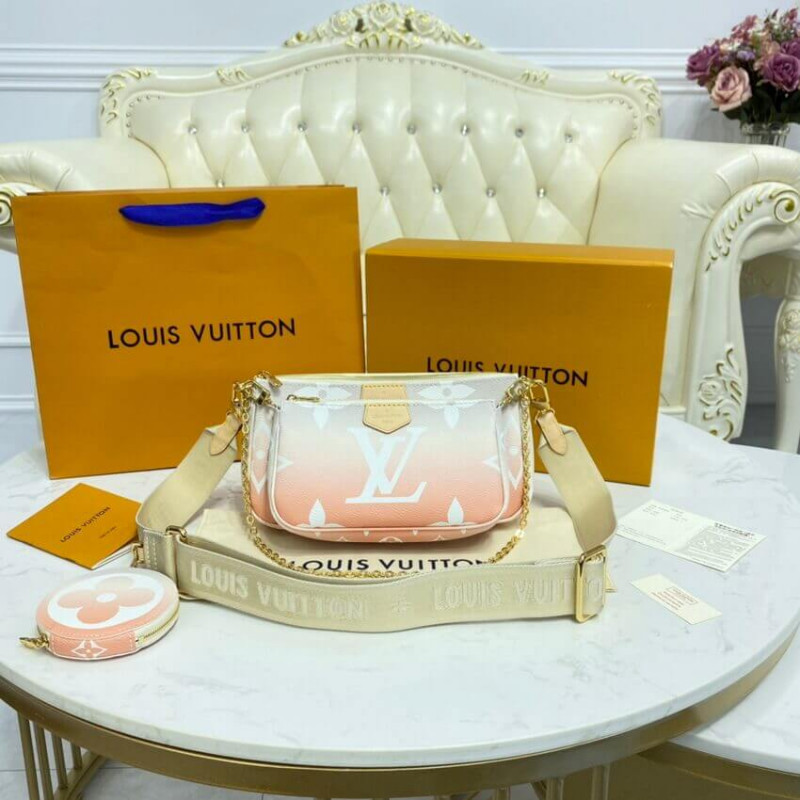 The versatile Multi Pochette Accessoires is composed of a bag, a pouch, and a round coin purse, all made from pastel-colored Monogram Giant canvas. This hybrid bag features an adjustable jacquard strap with Louis Vuitton Malletier inscribed on it for shoulder or cross-body wear as well as a removable gold-color chain for hand and short-shoulder carry.