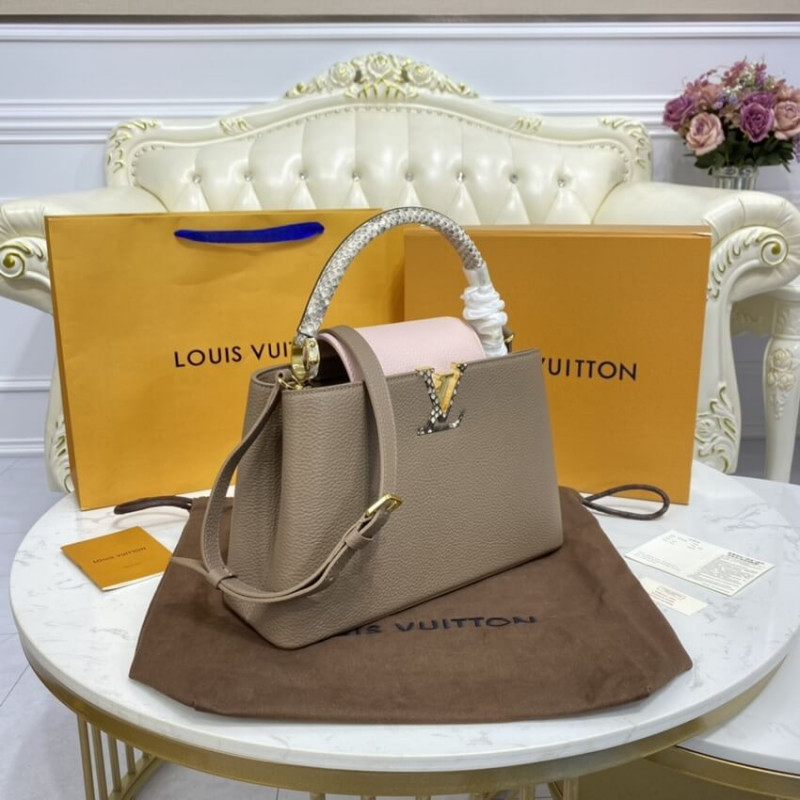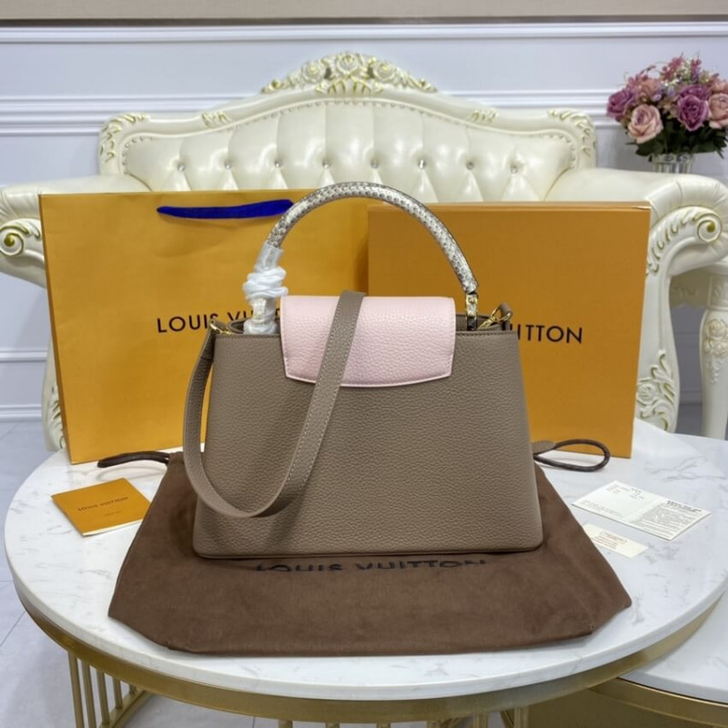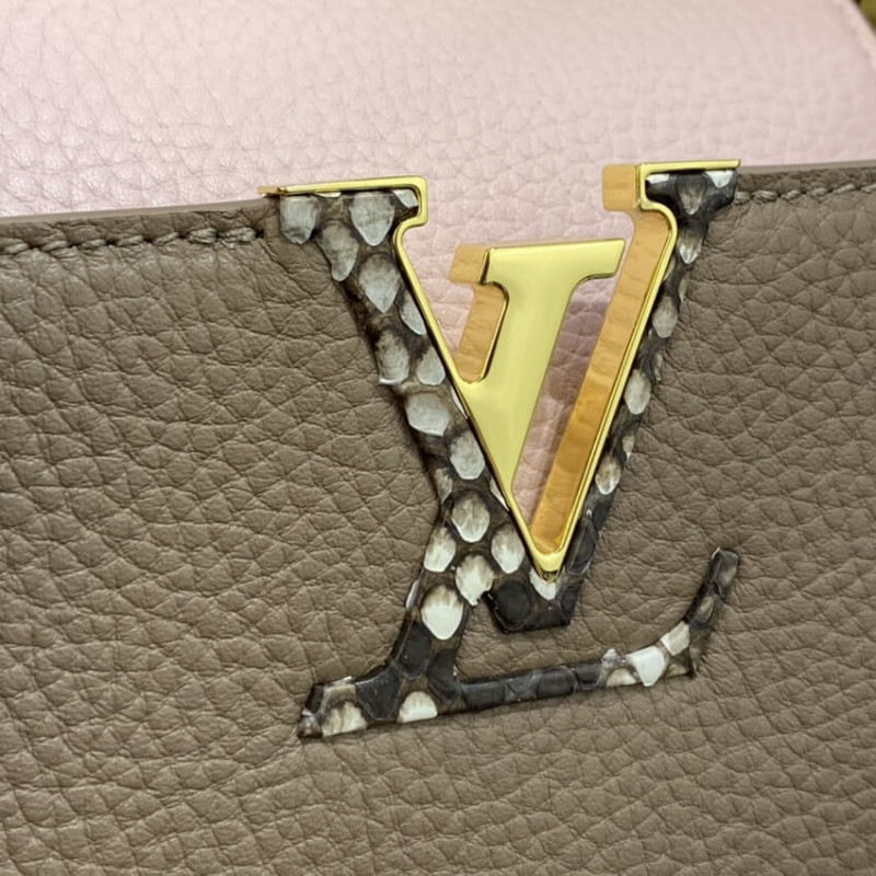This season, an elegant new colorway comes to the Capucines BB handbag: a delicate combination of soft tones, enhanced by exotic ayers leather on the handle and the LV signature. The top handle and wide removable strap deliver multiple carry options. A sophisticated look for day or evening.