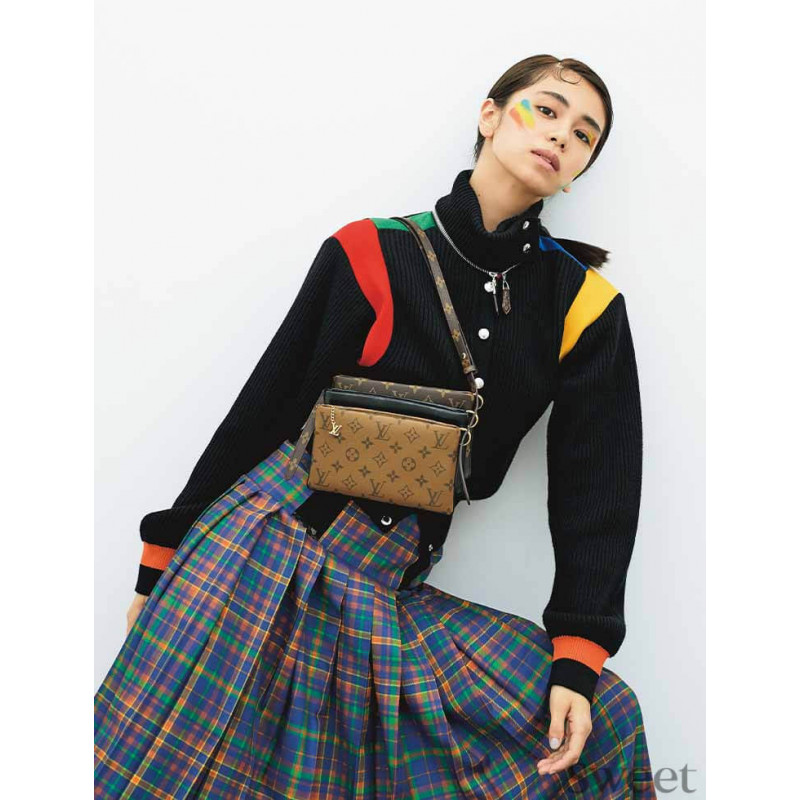 Nicolas Ghesquie?re introduces the LV3 Pouch, a playful grouping of three individual zipped pouches attached with metal rings, for the Prefall 2020. Fashioned from black lambskin with an embossed Monogram pattern, Monogram canvas, and Monogram Reverse canvas, the piece has an adjustable leather strap for shoulder or cross-body carry.
