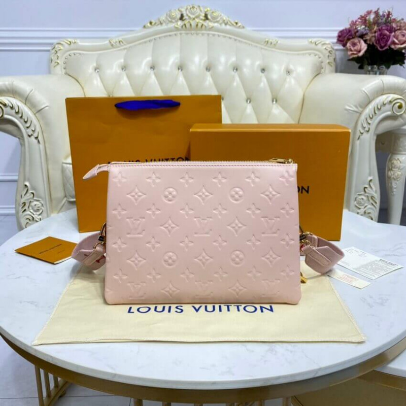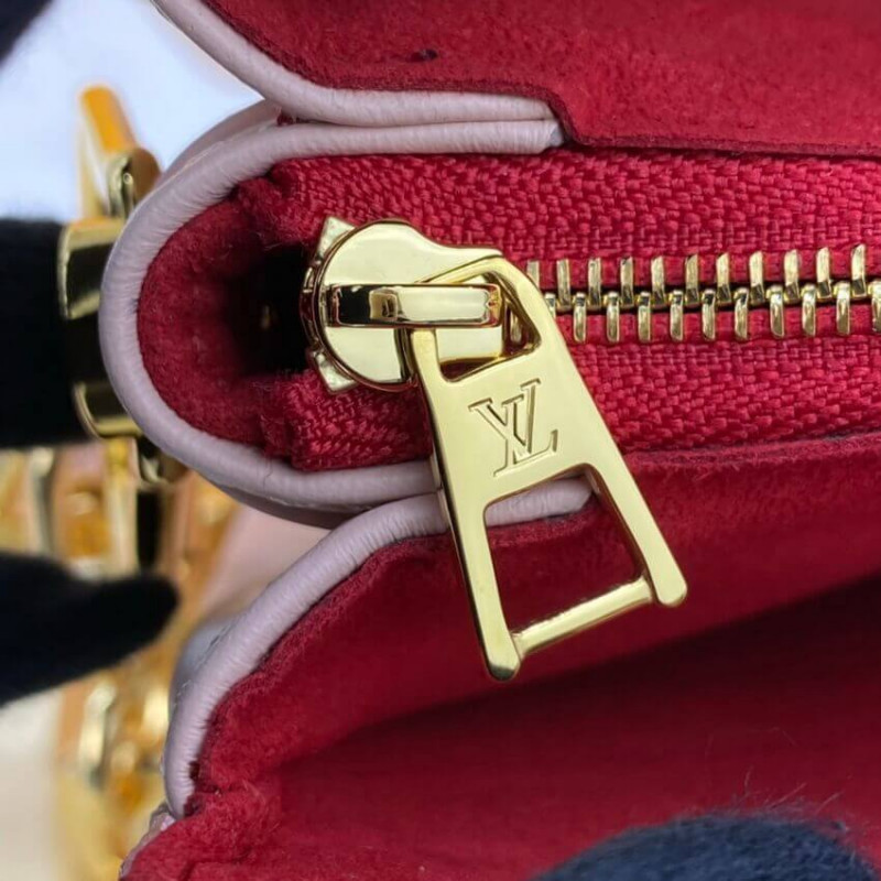 Fashioned from puffy lambskin and accessorized with a chunky gold-color chain, this Coussin PM handbag is part of the Vuittamins capsule collection. Its bright vibrant colorway is Nicolas Ghesquière’s translation of the joy and audacity of women. The Coussin can be worn cross-body with the strap, as a chain baguette, or carried under the arm.